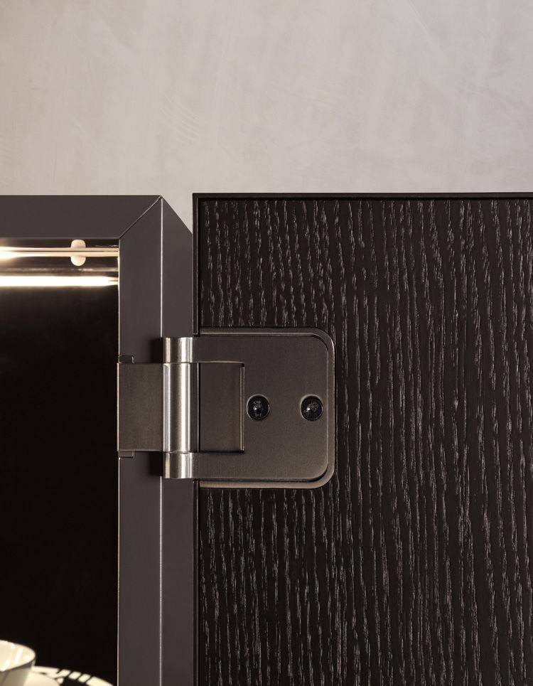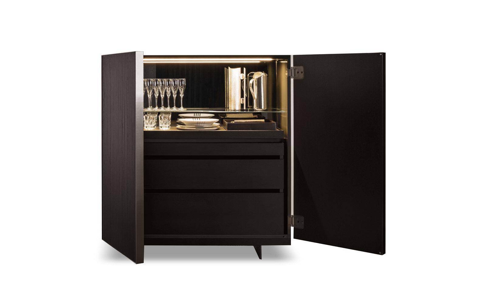 The interior fittings for each element were carefully designed to respect the function served by each piece. The cupboard was crafted for placement in the dining room and the luxurious interior fittings are exquisitely suited to this use – opening the door turns on the LED strip lights positioned in the upper shelf. The space is thoughtfully divided to accommodate a clear, beveled glass shelf for storing glasses and a pull-out shelf covered in saddle-hide, a cutlery drawer also covered in saddle-hide, and two generously-sized drawers designed to hold plates and other tableware items.