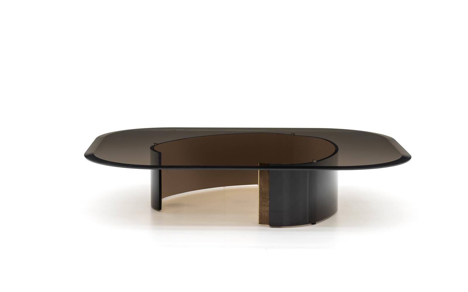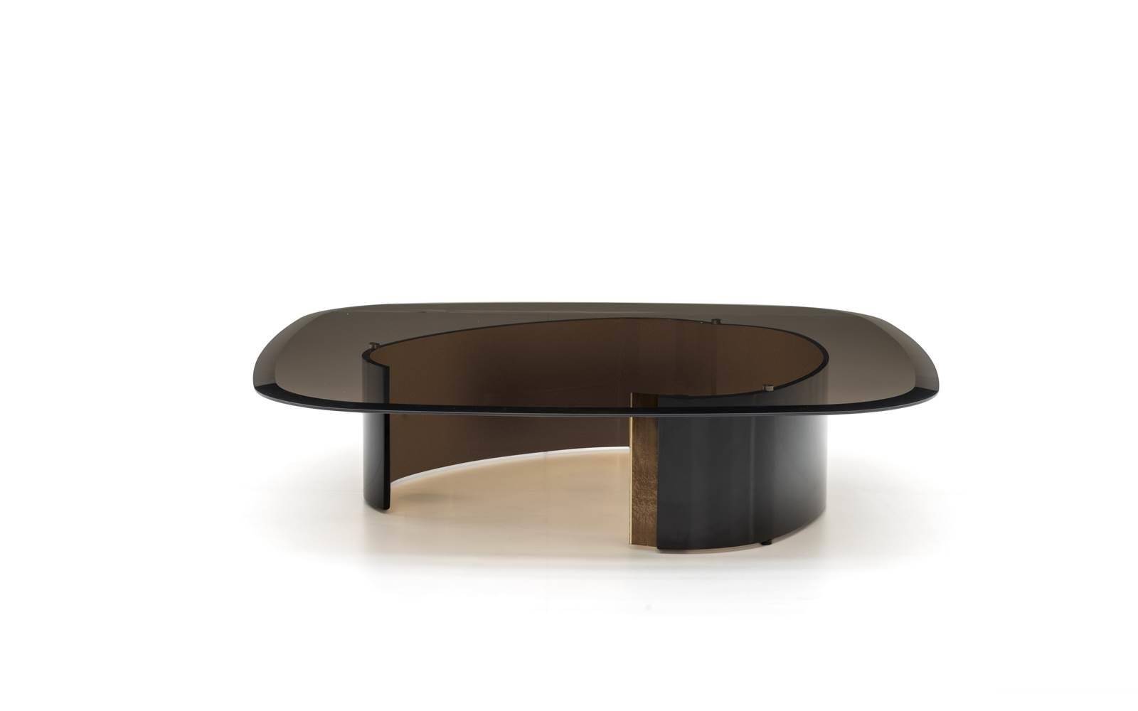 The shape of the base is visible through the elegant top in round, square and rectangular bronzed glass, delicately chamfered round the edge.