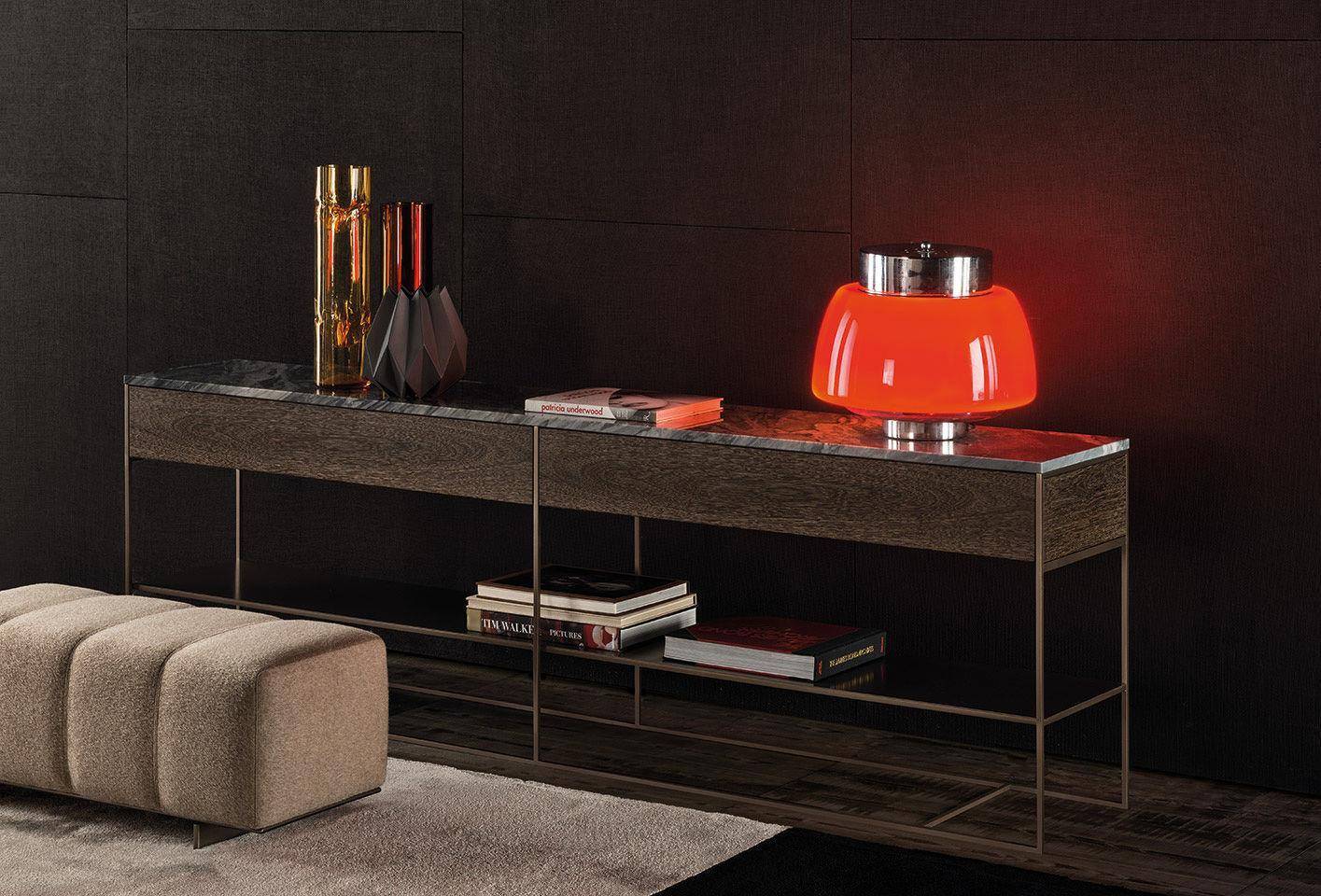 The slender iron structure now comes in a Bronze satin finish. Several new versions of the top are also available: glossy lacquered Sand, Sucupira veneer stained Mink color, and Bardiglio Nuvolato or Calacatta marble. The under shelf is also in satin finish metal painted Bronze. Some of the consoles are equipped with drawers in Sucupira stained Mink color.