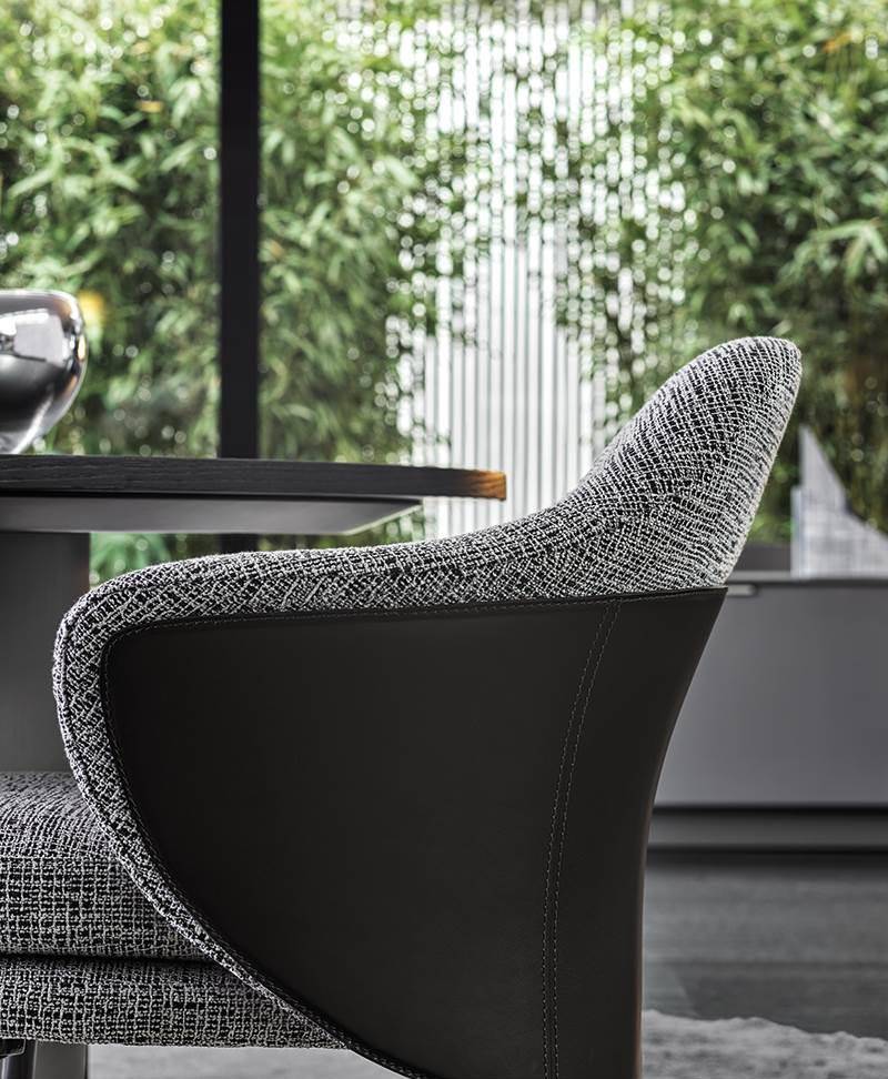 A saddle-hide or leather element designs a wing that embraces the armchair, sustaining the frame like a sculptural bustier, characterised inside by the inviting softness of the seat and backrest. Behind the apparent simplicity of the design lies an advanced technological process used to make both the padding with different textures of foam and the saddle hide or leather bustier, made using two different Baydur® moulds, which perfectly follows the curved line of the armchair.