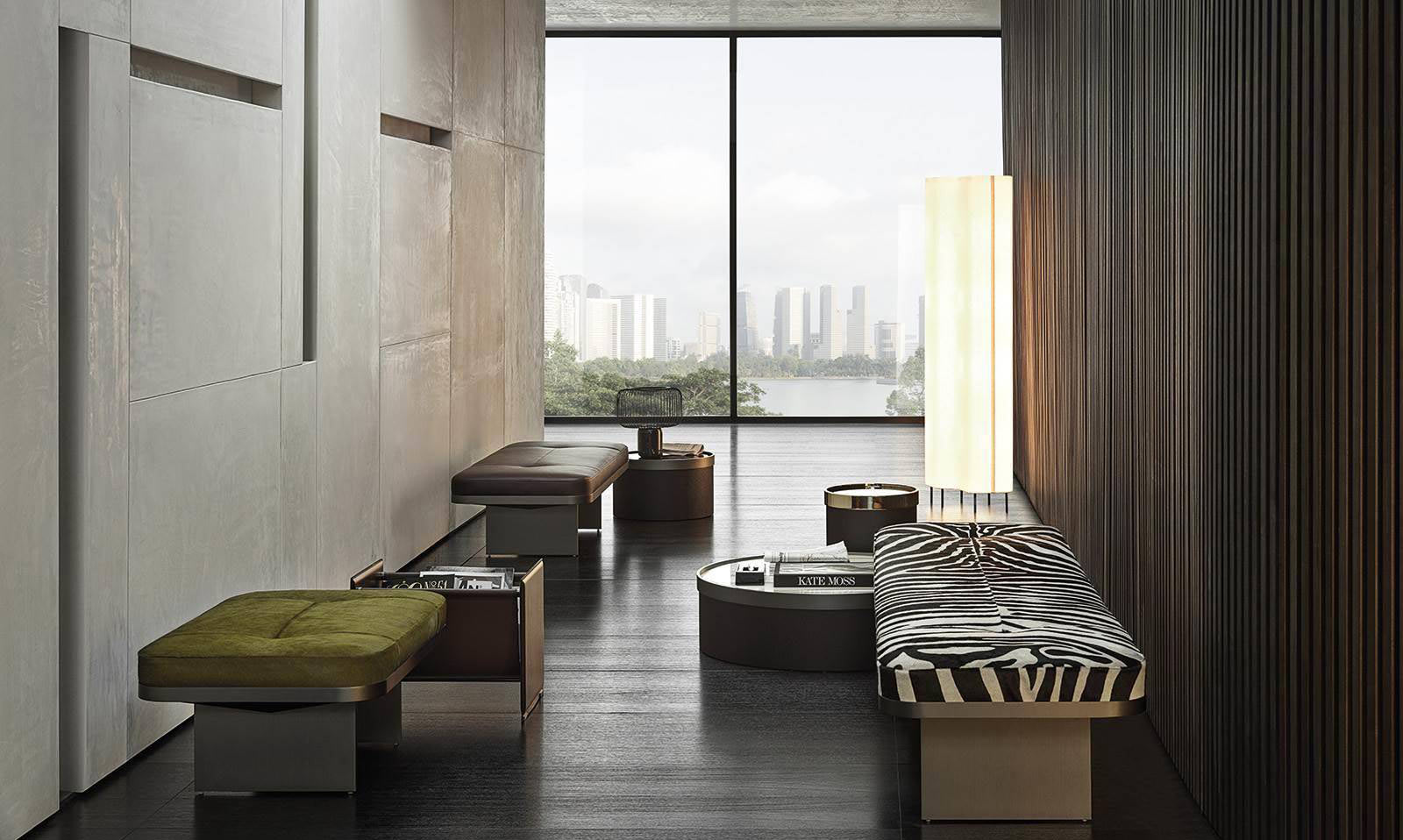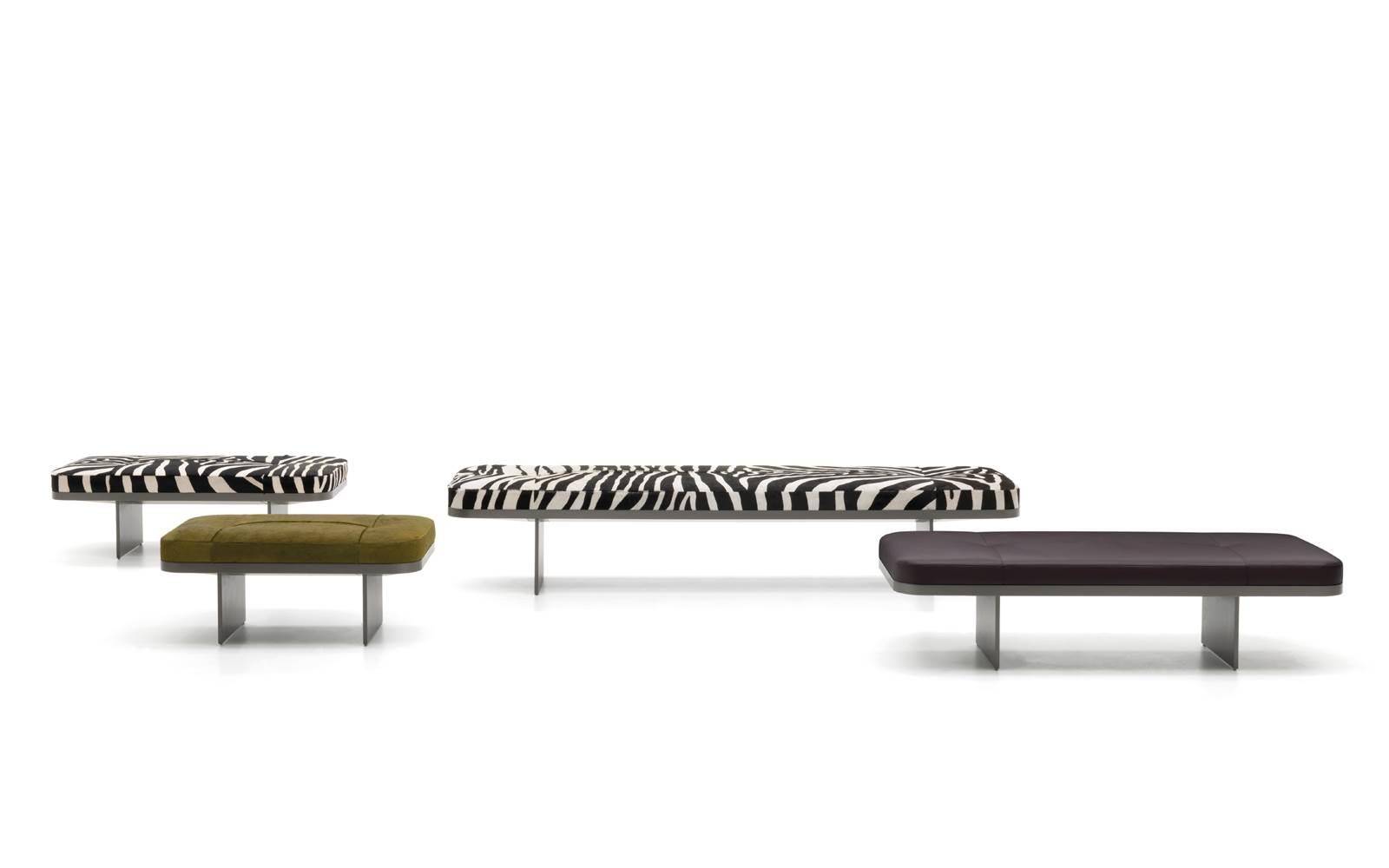 The Clive family is completed by a series of benches with padded seats, upholstered in leather or fabric, enhanced by an array of seams that underscore its fine sartorial quality.