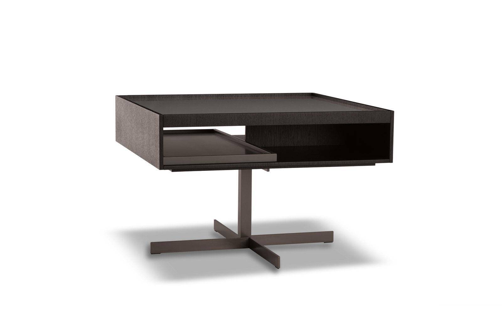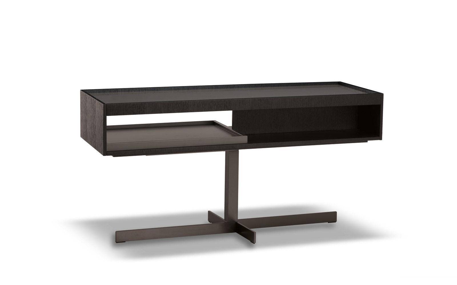 The Close side tables fit perfectly in the space between the backrests of the Yang sofa, offering practical surfaces: any useful object is within reach or tidily stored in the compartment below, while relaxing comfortably on the sofa. The simple metal base ends with a cross-shaped floor base in refined satin-finish Bronze. The upper part has a compartment with a removable tray that can be accessed on both sides and comes in two versions: structure in open pore Moka lacquered oak, a glossy Clay-colored lacquered top with inside tray in a matt Clay lacquered finish, or with a matt Clay lacquered frame and top and inside tray in oak with an open pore Moka lacquered finish. In addition to the side tables which come in various sizes, Close also includes a console table, a desk and some bedside tables.