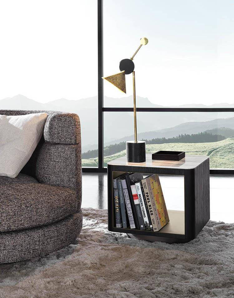 Formed by the juxtaposition of suspended geometric volumes and reduced heights, the Milton side tables are available in the circular, square, rectangular and trapezoidal versions. The geometries are softened by the rounded corners that recall the sinuous curves of the Alexander “Drop” seating system. Characterized by a more contemporary and decorative reinterpretation of the lines of the Seventies, they showcase a refined game of combinations of precious materials and organic geometries.