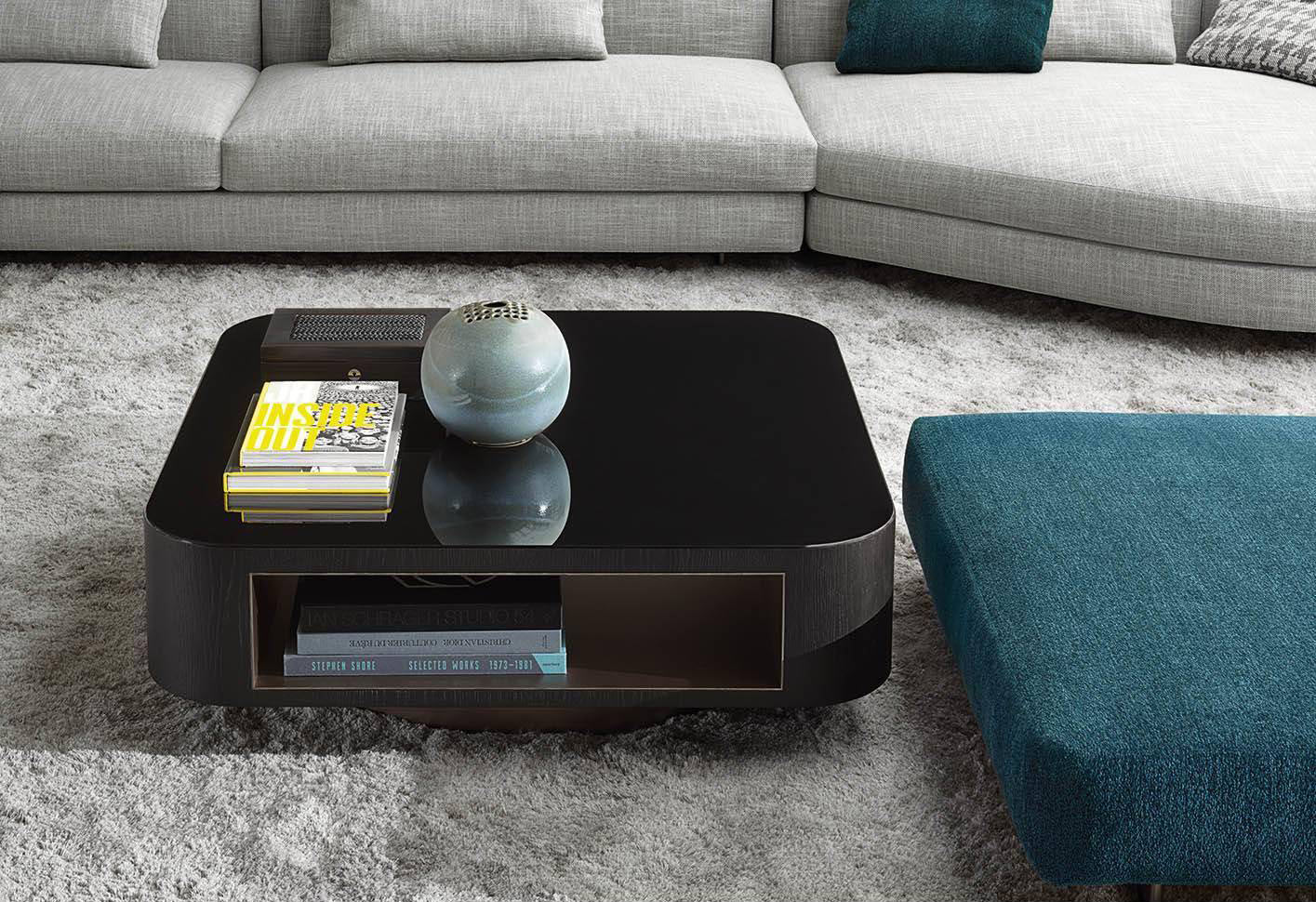 The family is completed by squared items that feature drawers or a void space, which is enhanced by a sheet of satin-finished metal that covers the internal surface. The latter is also available in a revolving version.