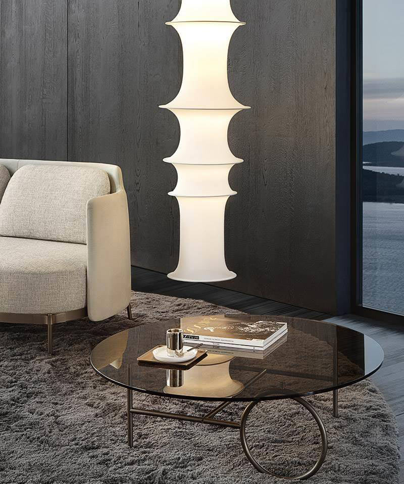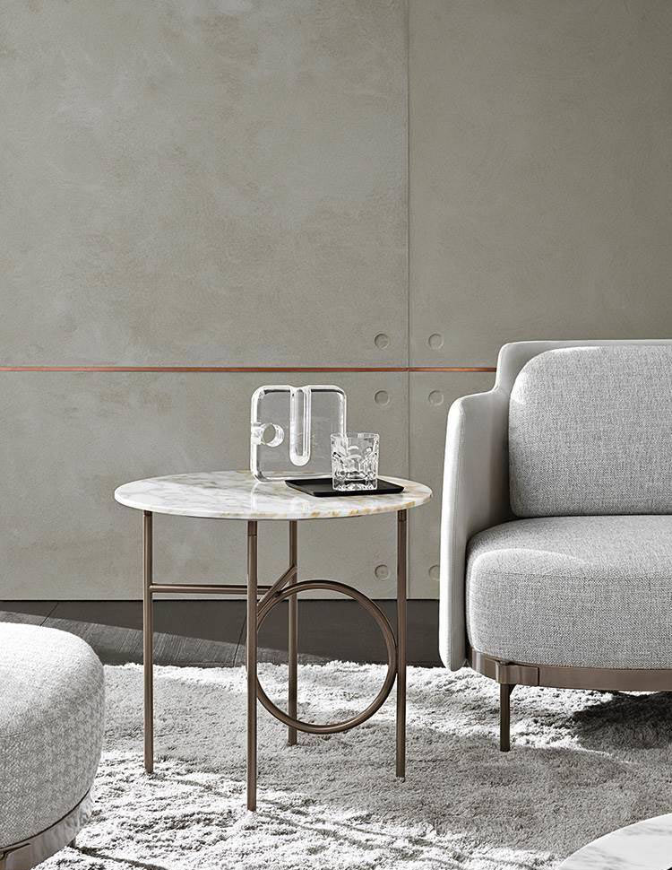 The metal frame, available in Bronze, Copper or Black-Nickel, comes in different heights. The Ring tables are completed by an oval or circular top, with various diameters, which are customizable in bronzed glass, Calacatta marble or Licorice brushed ash.