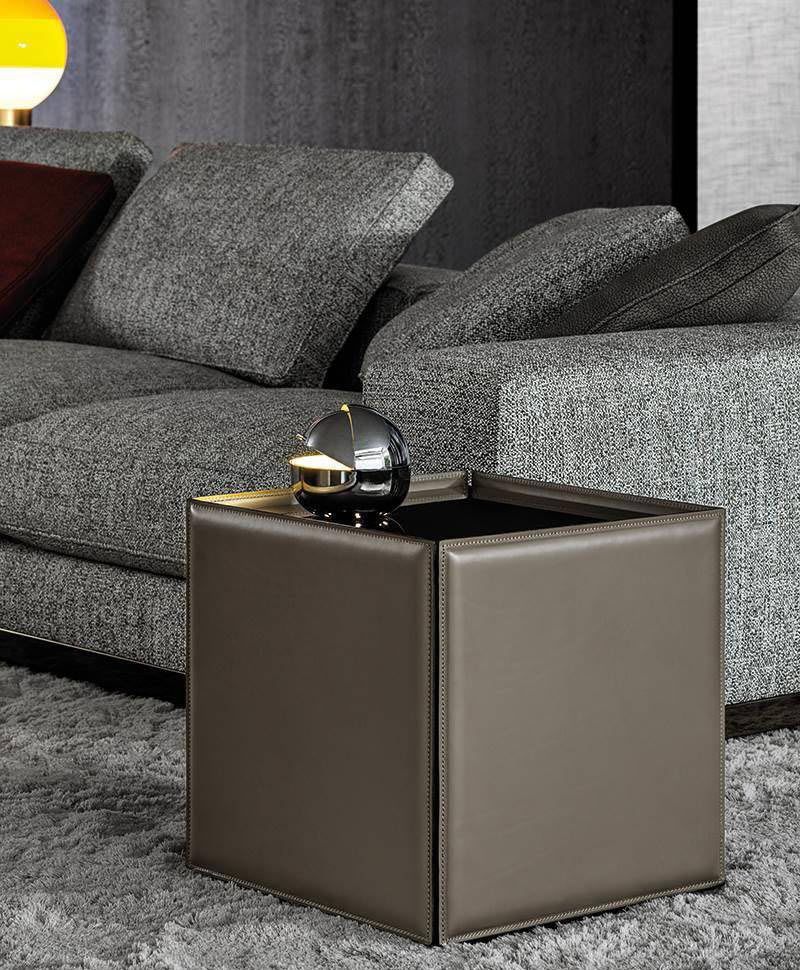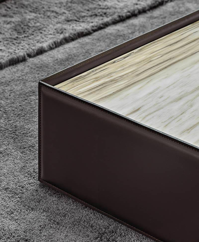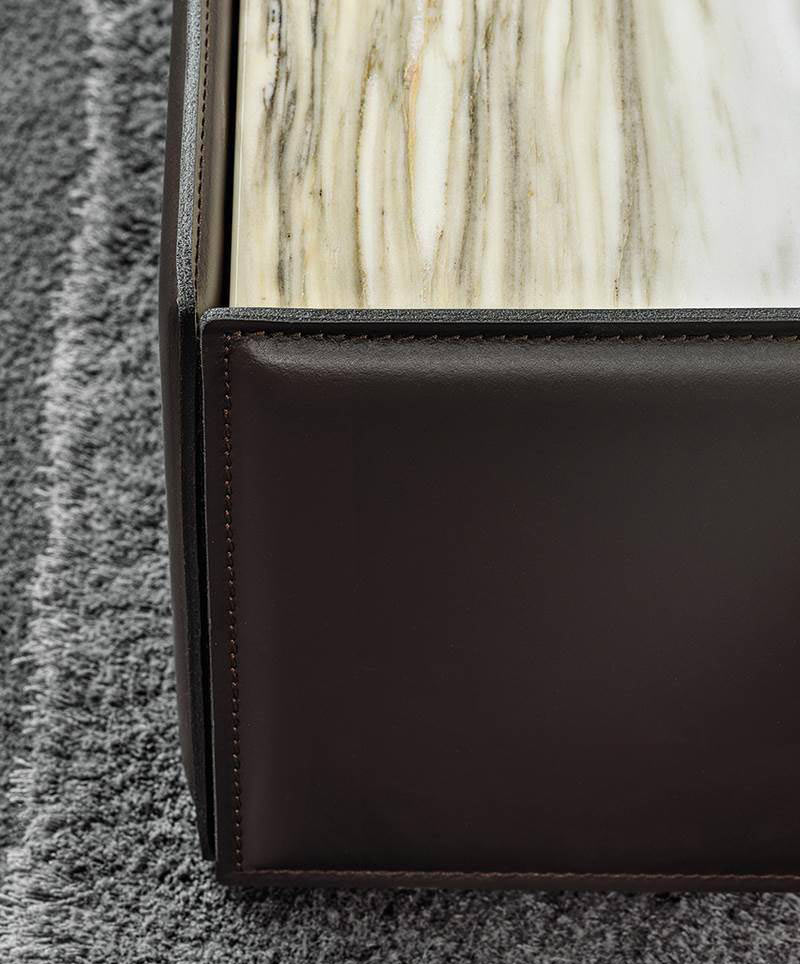 With a strong textural impression created by the unconventional combination of materials such as marble and saddle hide, Side is composed of four panels that embrace the top, covered in saddle hide and distinguished by a light profile - with visible stitching that mark its perimeter. The top is available in Black-coloured back-painted glass, Zebrino or Stone Grey marble, and is set into the frame.