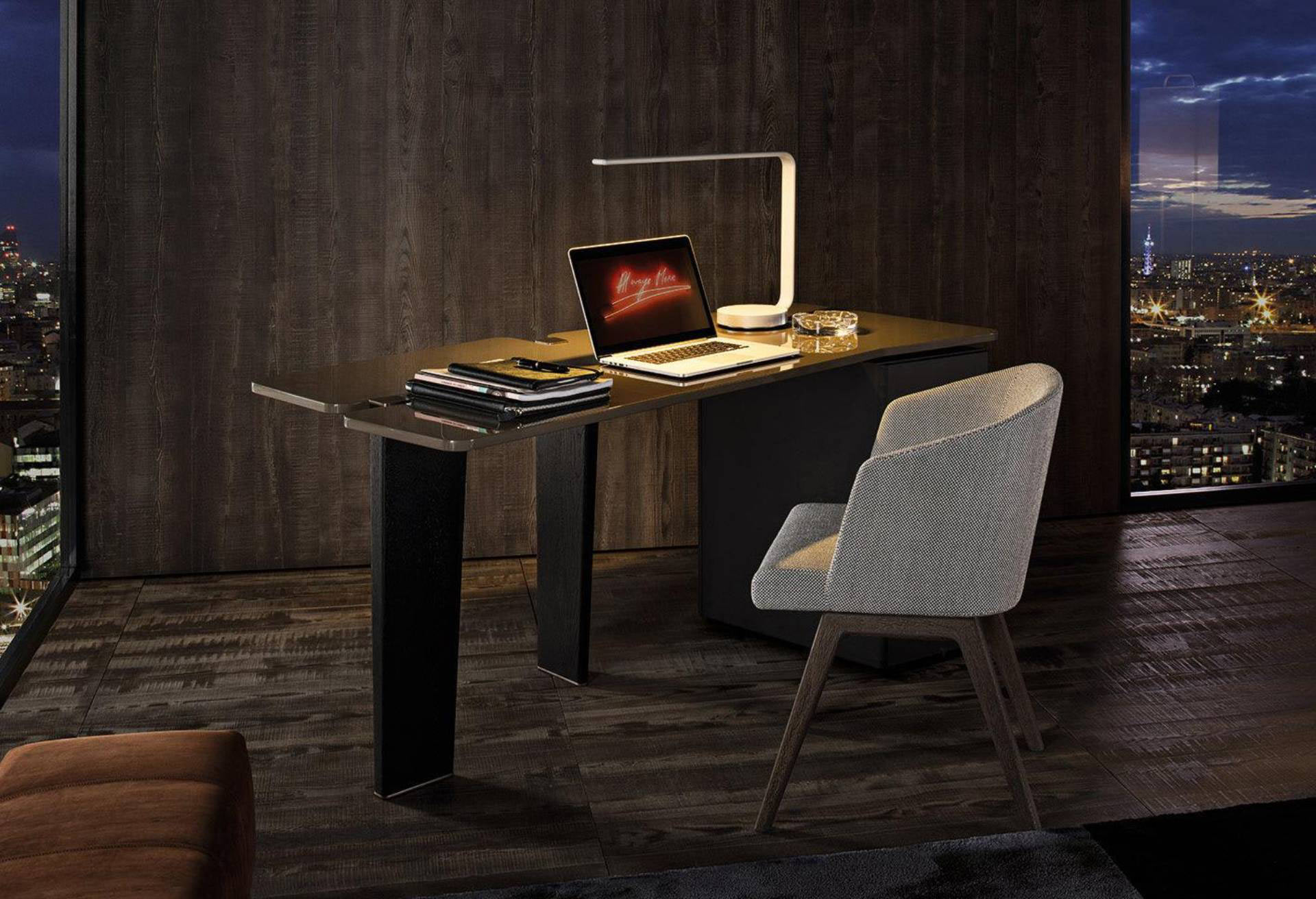 In addition to accent tables, the Jacob family also includes a writing desk with the top in Sand or Mud glossy lacquer finish, or in Sucupira veneer with stained Mink finish. The writing desk also has a convenient chest-of-drawers in wood with matt black lacquer finish.