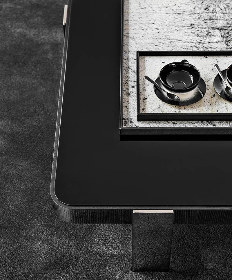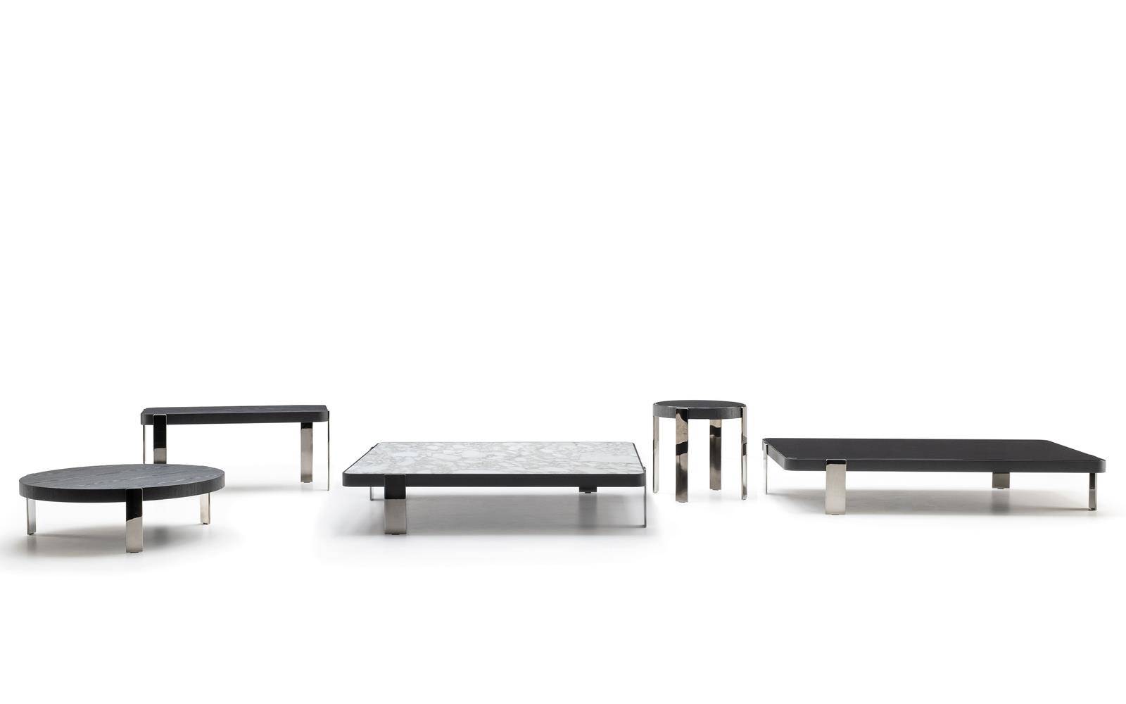 A series of round, rectangular and square coffee tables in different sizes and heights, available in three versions: with top in Calacatta marble or Black pâte de verre - inserted in a frame in brushed ash wood featuring a Liquorice colour lacquered finish - or entirely in brushed ash wood with Liquorice colour lacquered finish. The coffee tables sit on steel legs with a Black-Nickel finish.