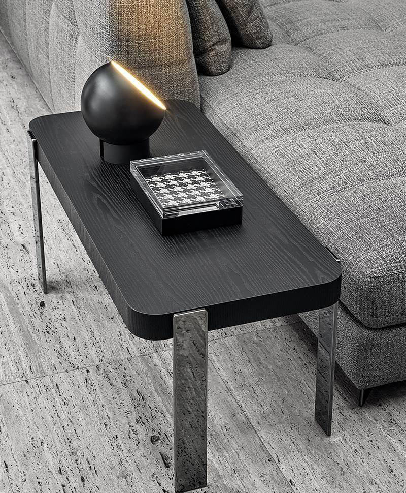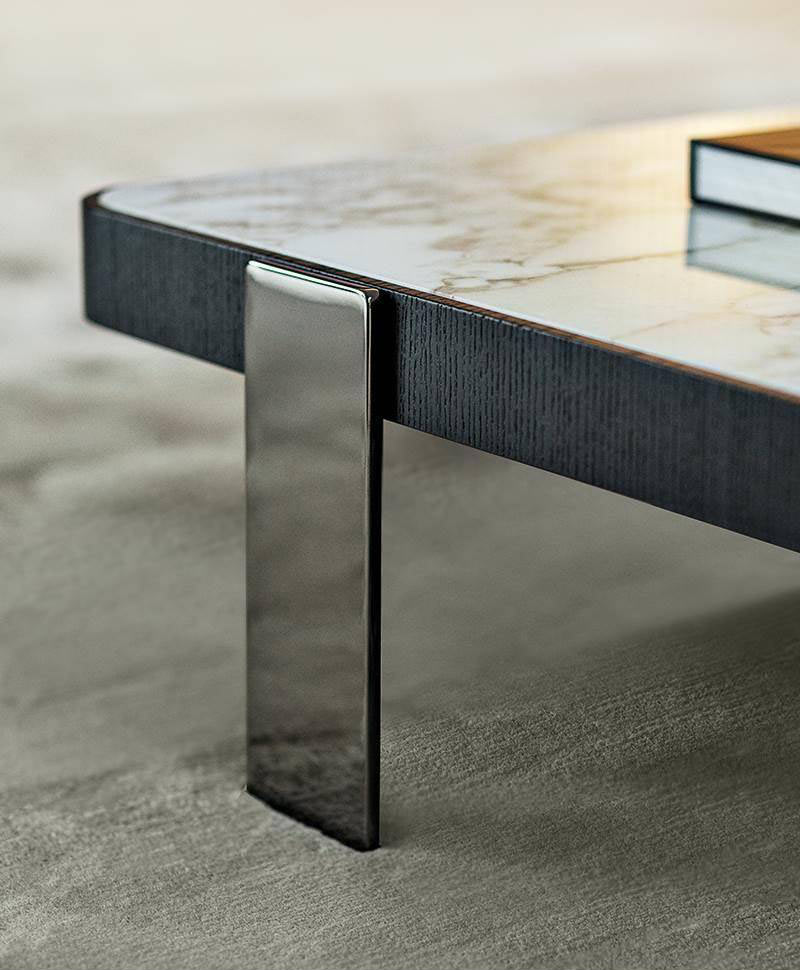The Mattia coffee tables, characterized by clean lines and by the same protruding steel feet that distinguish the seats, reinterpret in a contemporary way volumes and design sign of the early Seventies.