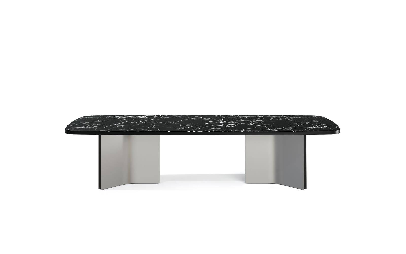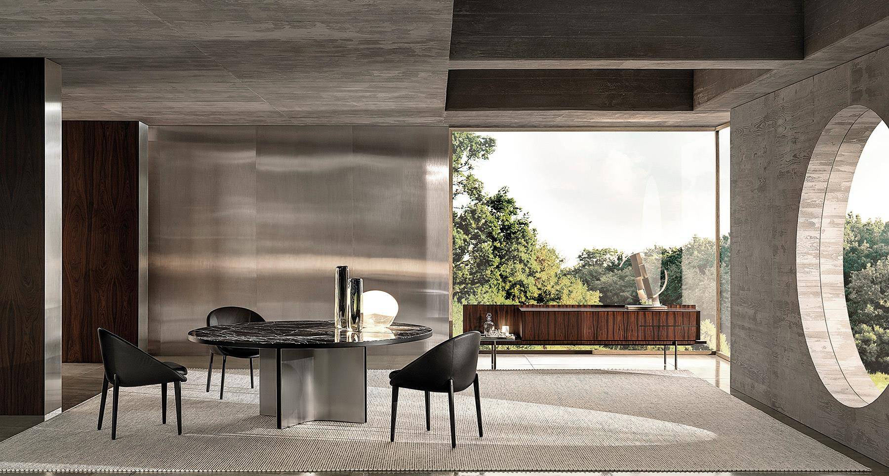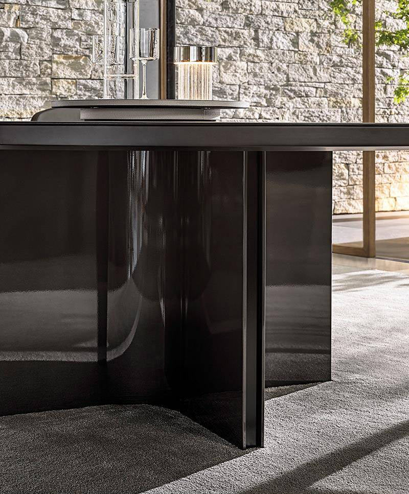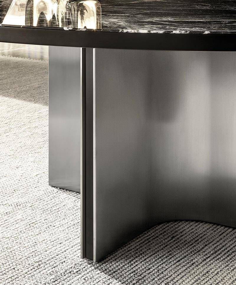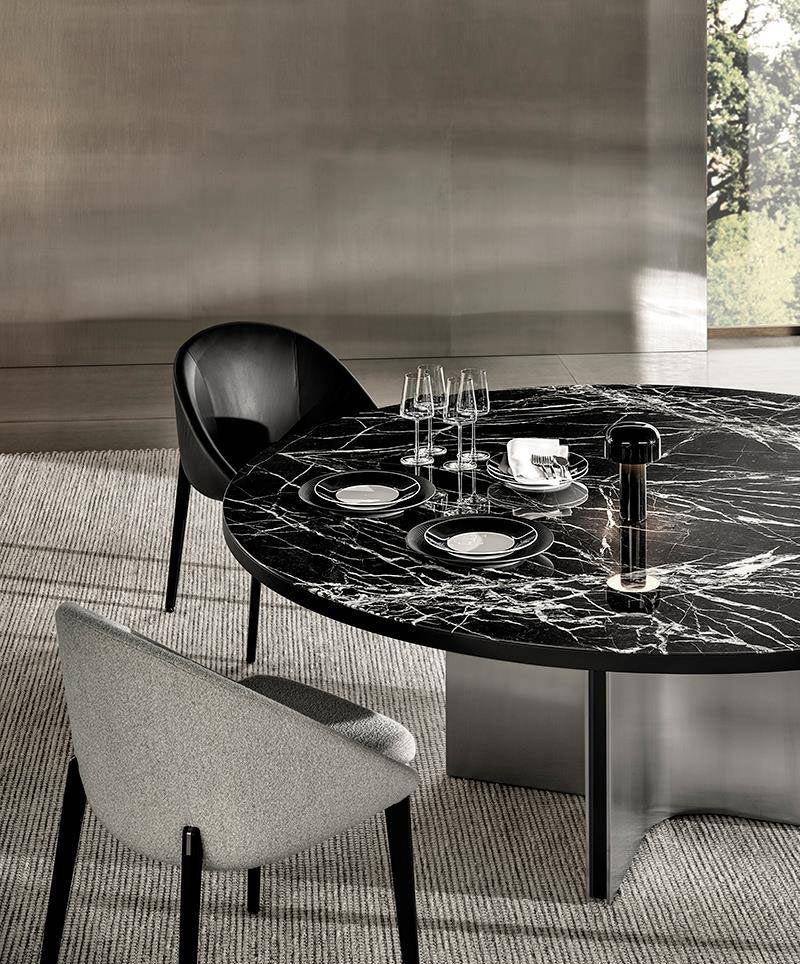 With its bold, sculptural-shaped base, which draws a series of quarter circles, illuminated by the glints of the metal, and interspersed with a black insert, the Marvin table makes an impressive impact and is characterized by great versatility. It is part of a wide variety of dining tables with a clearly architectural inspiration, featuring bases in satin finish stainless steel or in Pewter-coloured varnished metal.