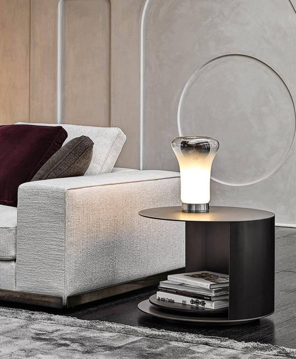 Its lightweight look and rounded forms make it ideal for occupying the space beside a sofa. It comes in two sizes, with different diameters and heights. In the shorter version, 44 cm tall, Richer unveils a surprise: a rotating disc positioned at the base, designed as a Lazy Susan tray, bringing the objects placed inside it into easy reach.