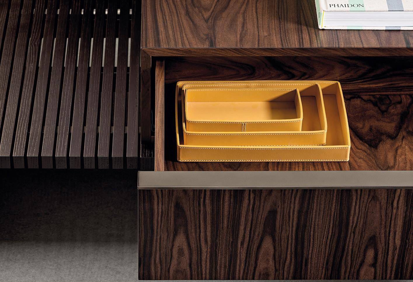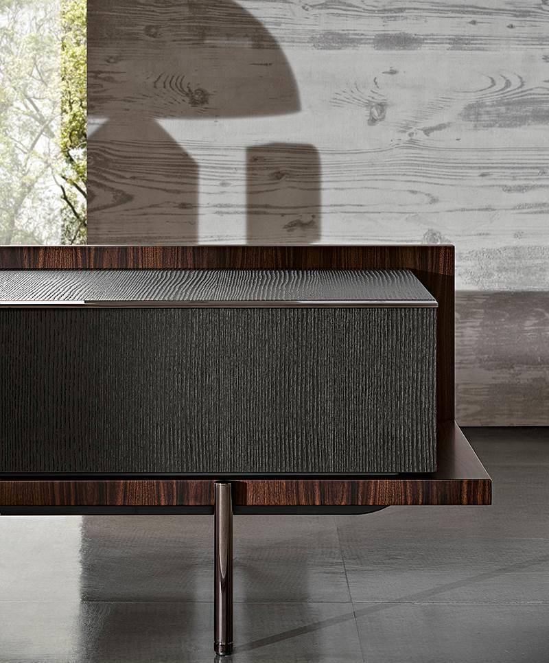 In the first two variants, the body of the unit rests on a solid wood base. Sporting volumes of different sizes, it comes equipped with drawers, all with handles in a polished varnished Brandy-coloured finish.