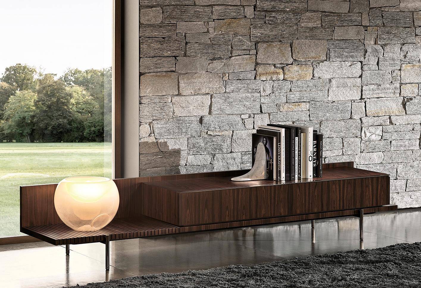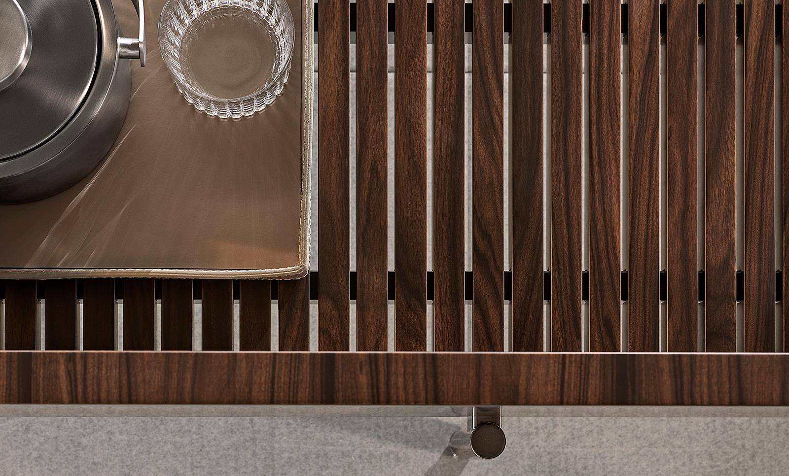 The living/TV unit, available in a single 273,5 cm version, offers a storage space with two drawers and surface made of thin staves in Dark Brown stained Canaletto walnut that lighten the volume and create an original interplay of transparencies.