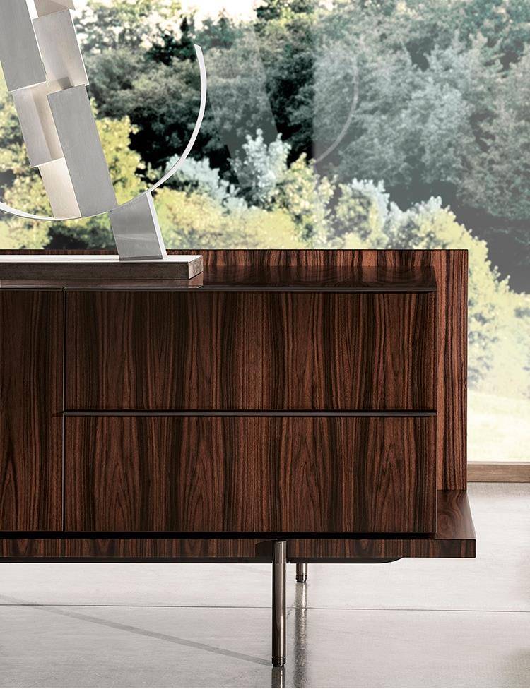 The dining version, available in the size 273,5 cm and in two different heights, offers four drawers, with a cutlery holder in Black saddle-hide in the top one. One important detail is the foot in aluminium with polished Brandy-coloured finish, which juts out from the line of the base.