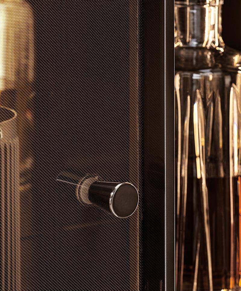 The cabinet, available in one size, 105 cm, is characterized by a frame with doors in stratified glass, coupled with a copper-coloured metallic mesh inside. This combination offers glimpses of the reflections created by the back panels in bronzed glass and by the double light strip, positioned on the sides of the frame. Inside, it houses a set of drawers in Dark Brown stained palisander Santos, with matt polyester lacquered finish.