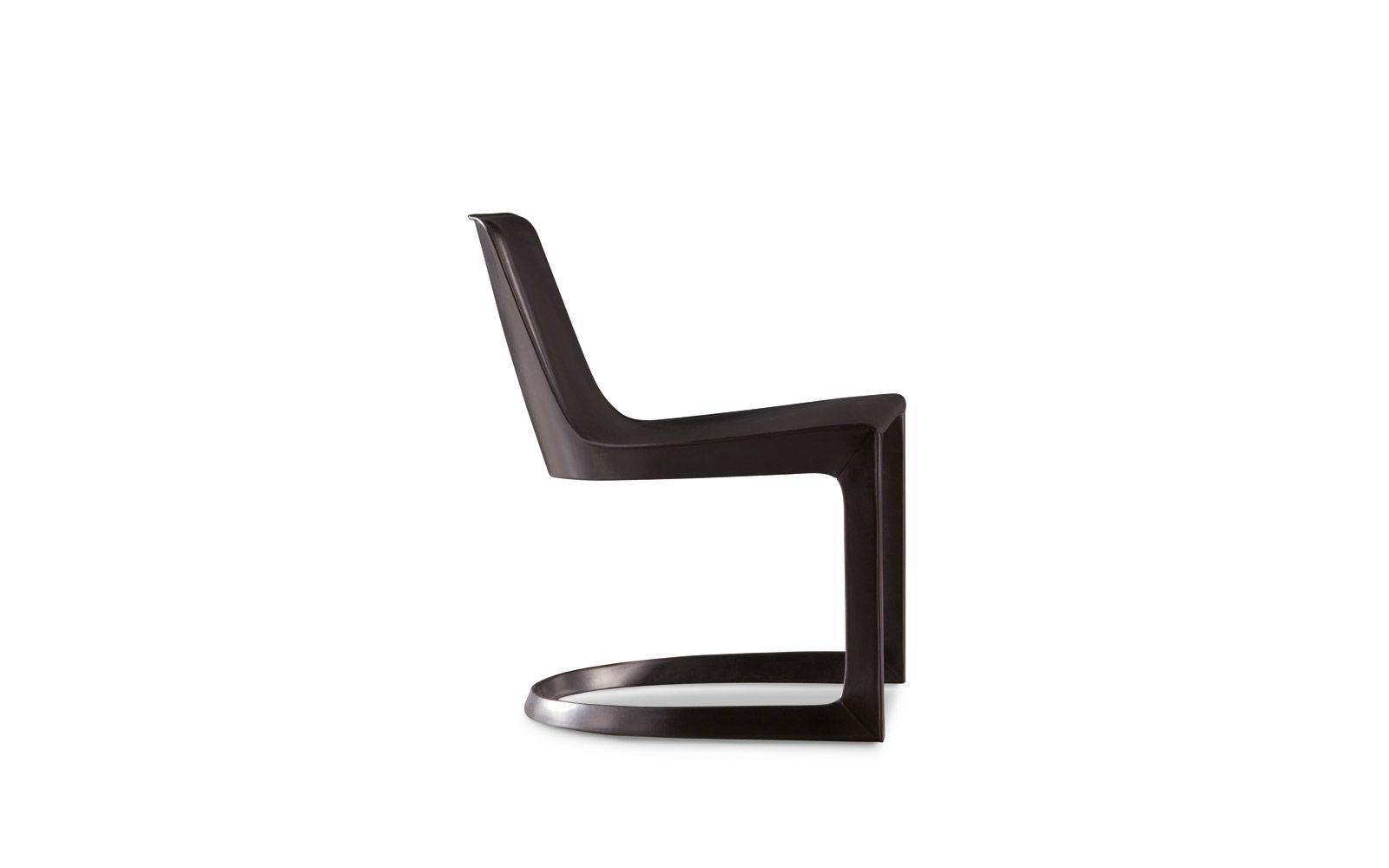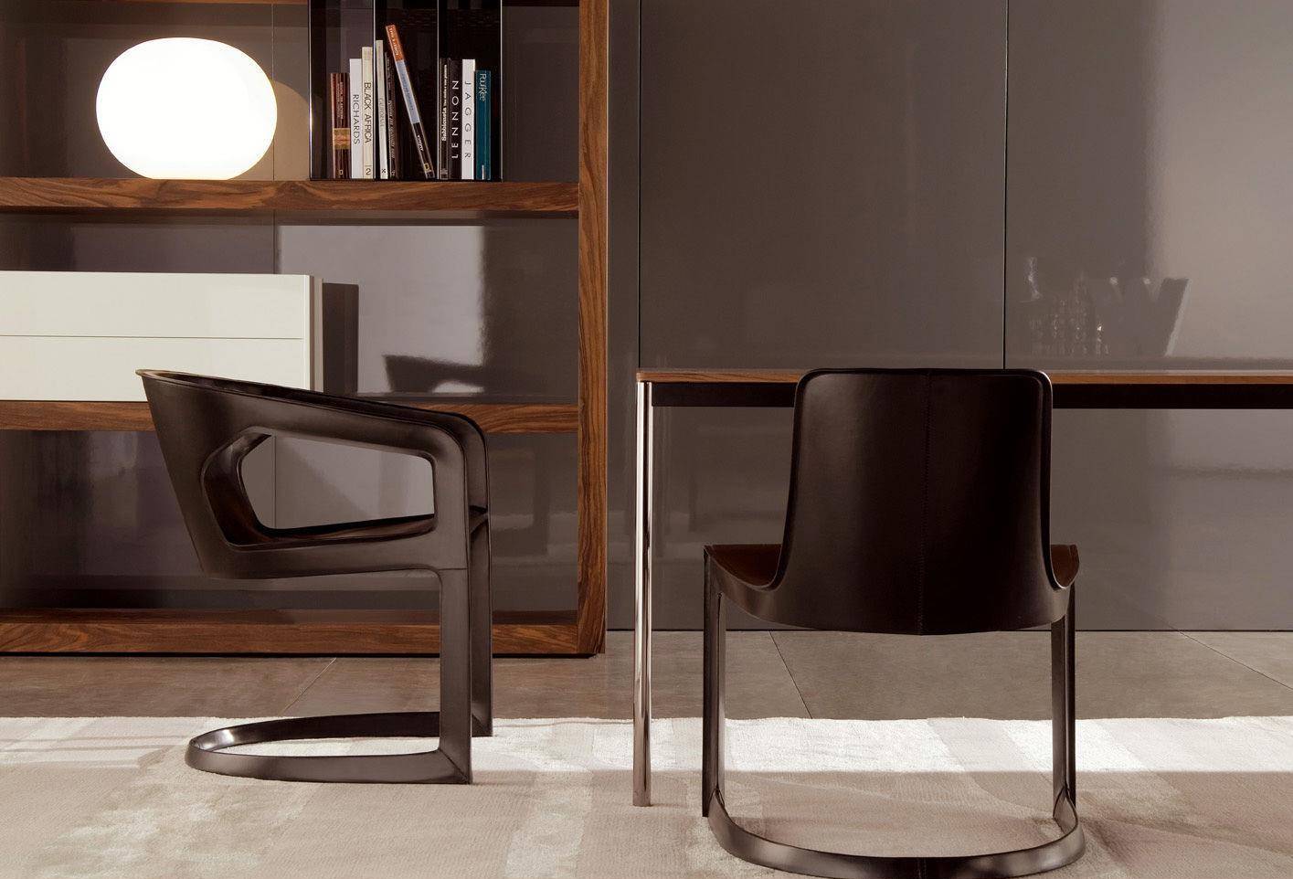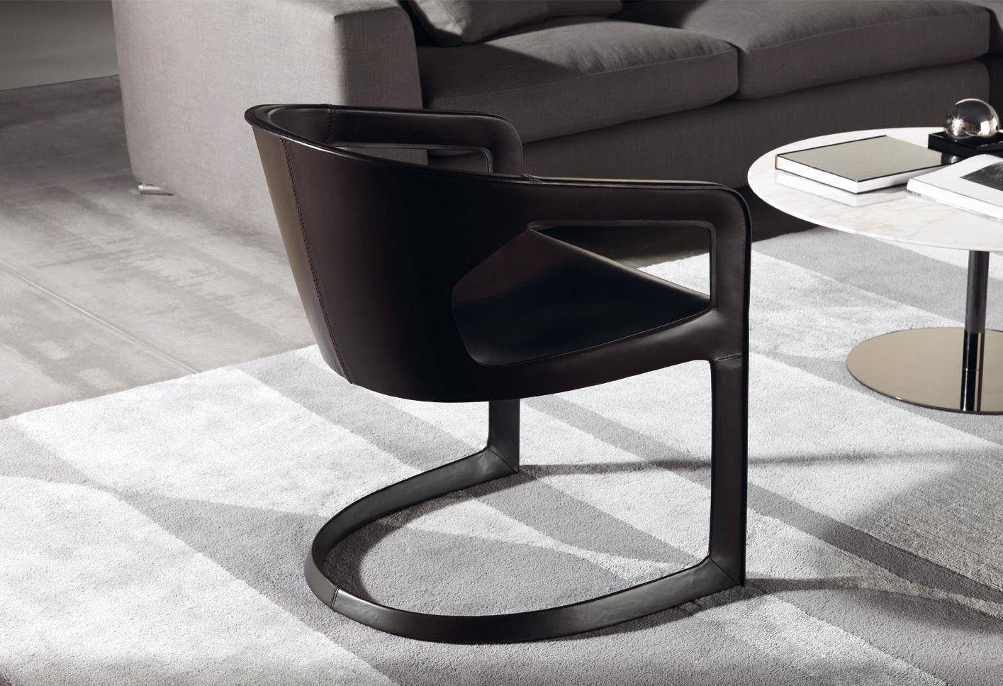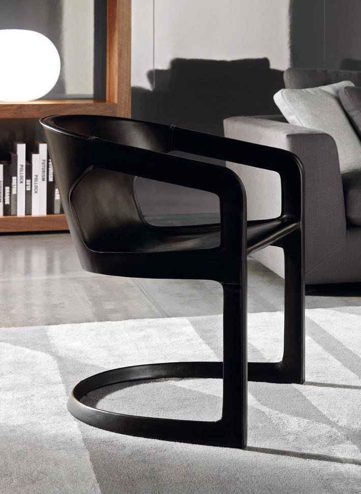 Chair and armchair based on soft, sinuous shapes enhanced by thermoformed saddle leather as the name for a new stylistic sign.