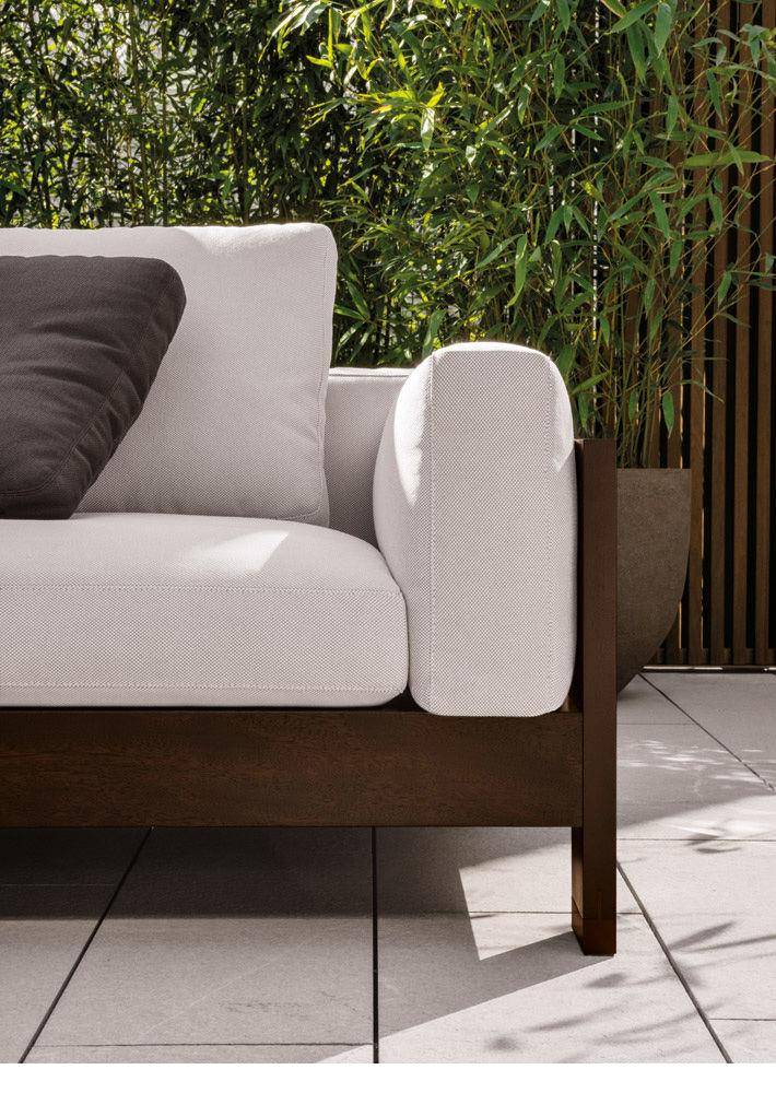 Диван Alison приподнят над землей на блоках из хромированного алюминия, окрашенного в цвет дерева, высотой 3,5 см. Подушки набиты высокоэластичным пенополиуретаном переменной плотности, обшиты экологически чистым водоотталкивающим волокном.
