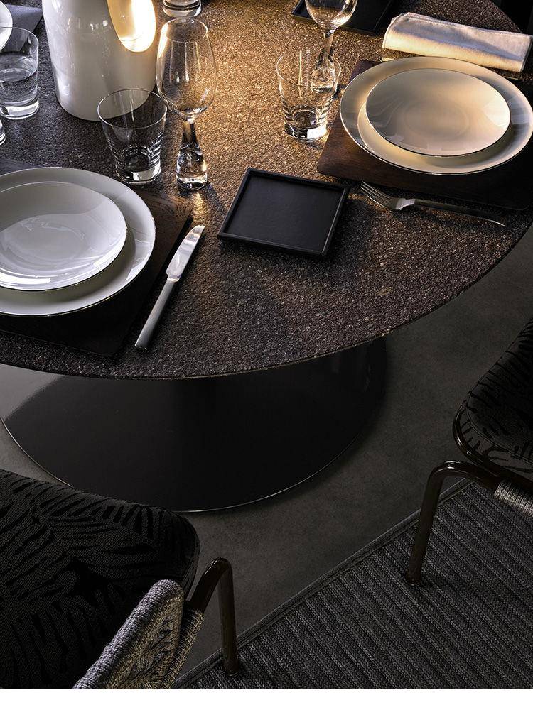 The base is made of tubular metal with painted glossy Pewter color finish. The round top comes in contoured, fine grain, brushed Purple Porphyry.