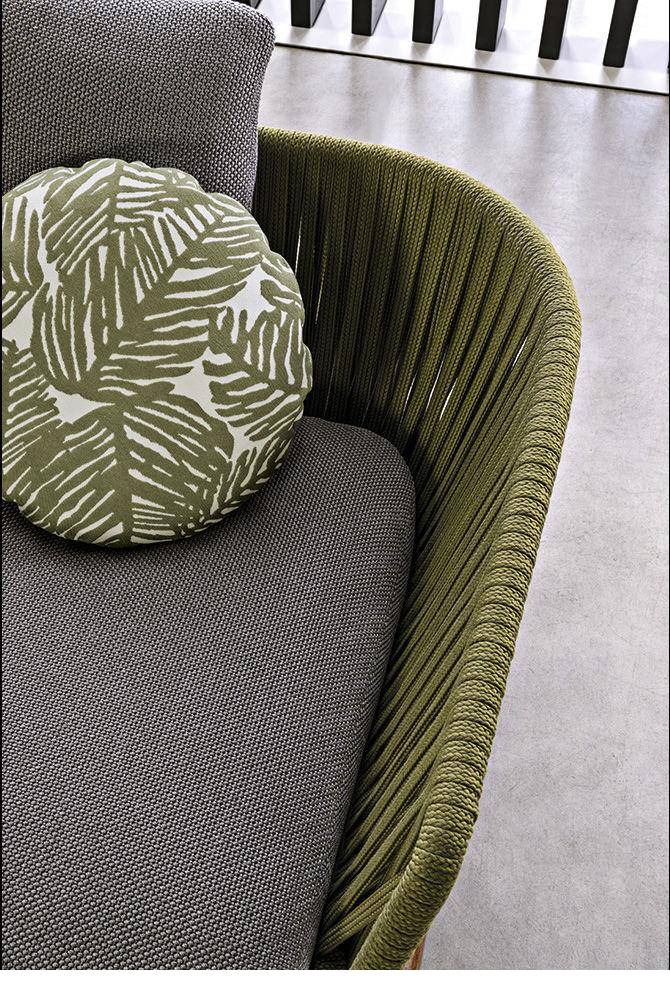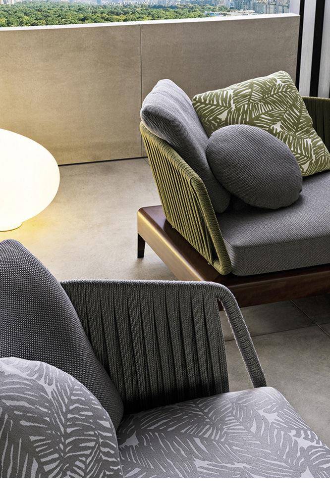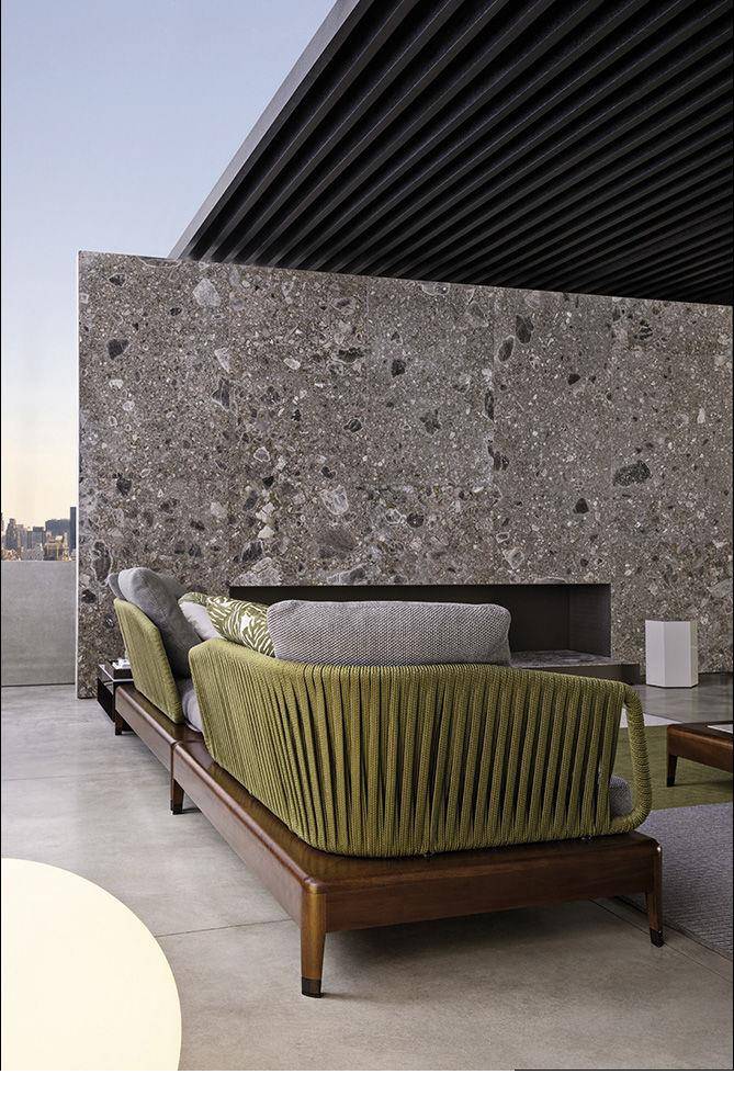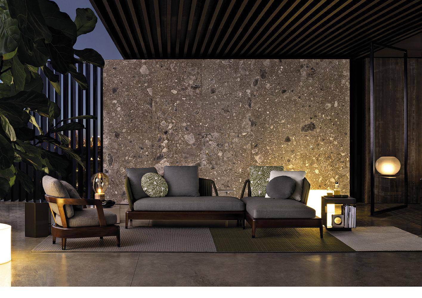 The elements are raised off the floor on Pewter color painted aluminum caps that are inserted into the wood base. The backrest and armrests are covered in a macro woven polypropylene webbing with a sleek, contemporary vibe and available in the following colors: Bamboo, Stone and Moka. The coffee table tops are in Corian® EC in the shade of Elegant Grey.