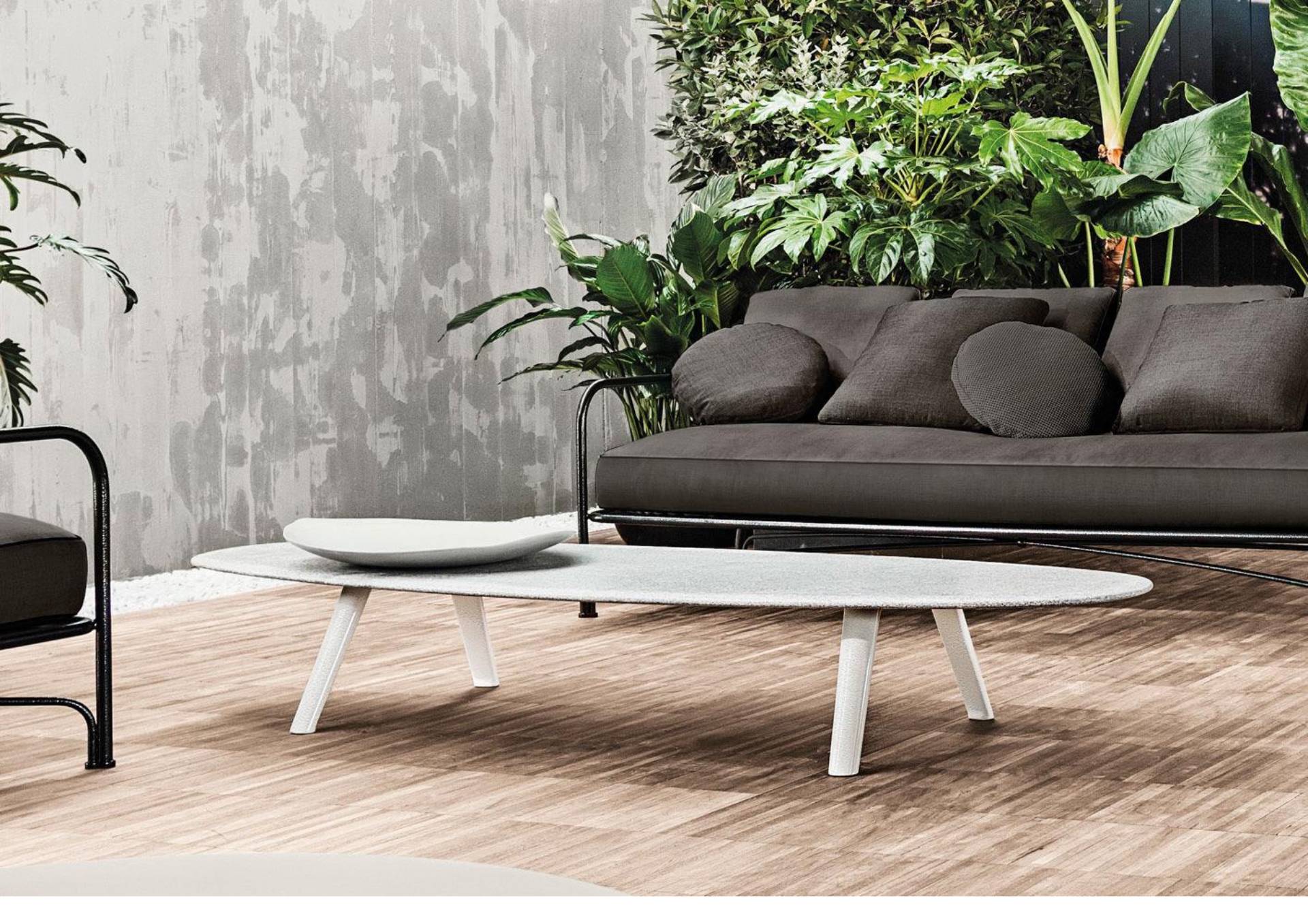 A coffee table with an elliptical shape with the top in Silver Beola stone with beveled edges, creating a visual and tactile effect similar to that of a river rock. The legs are in die-cast aluminium and are painted White with a bush hammered texture.
