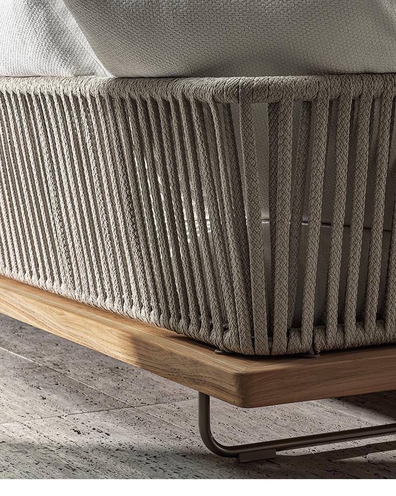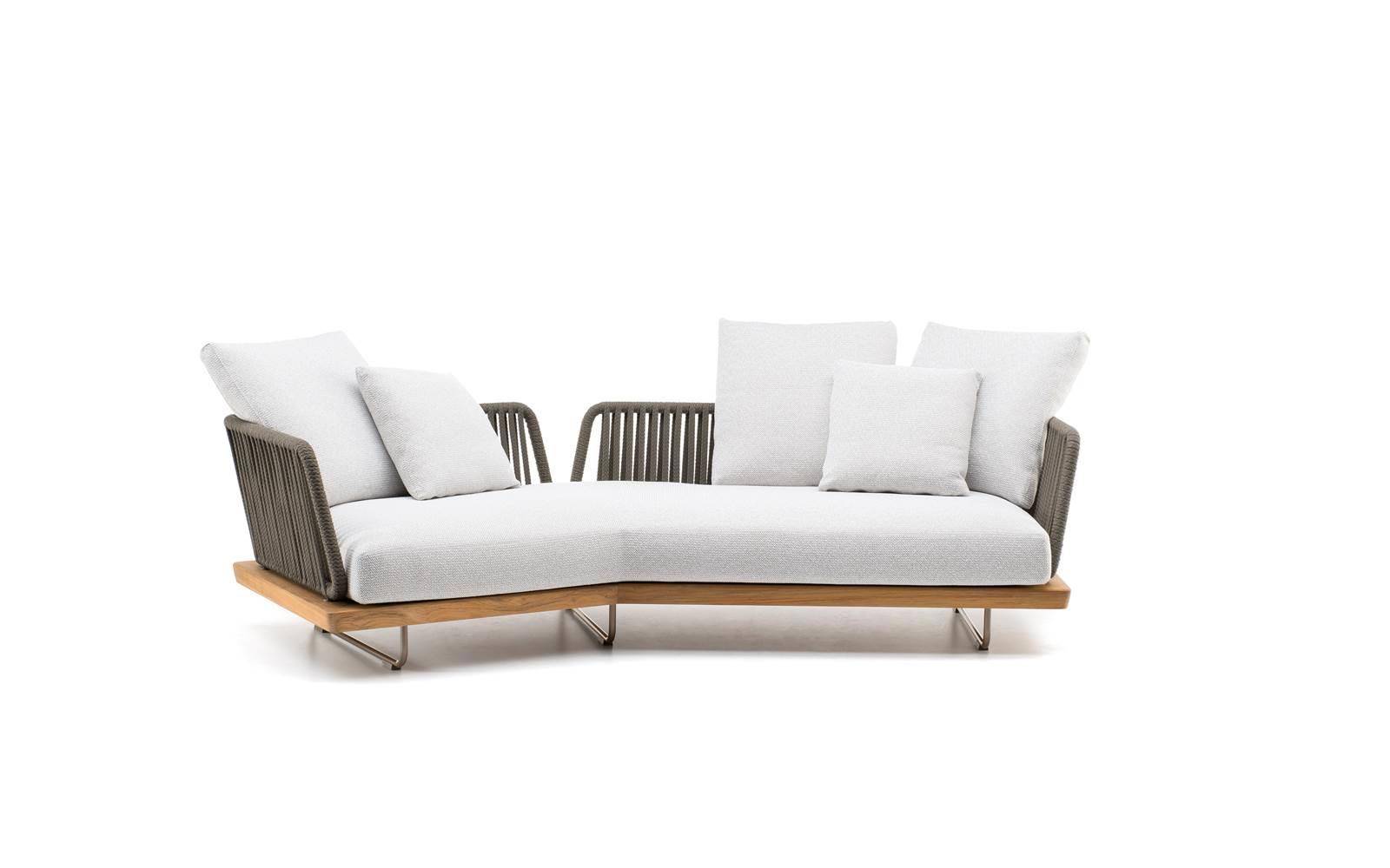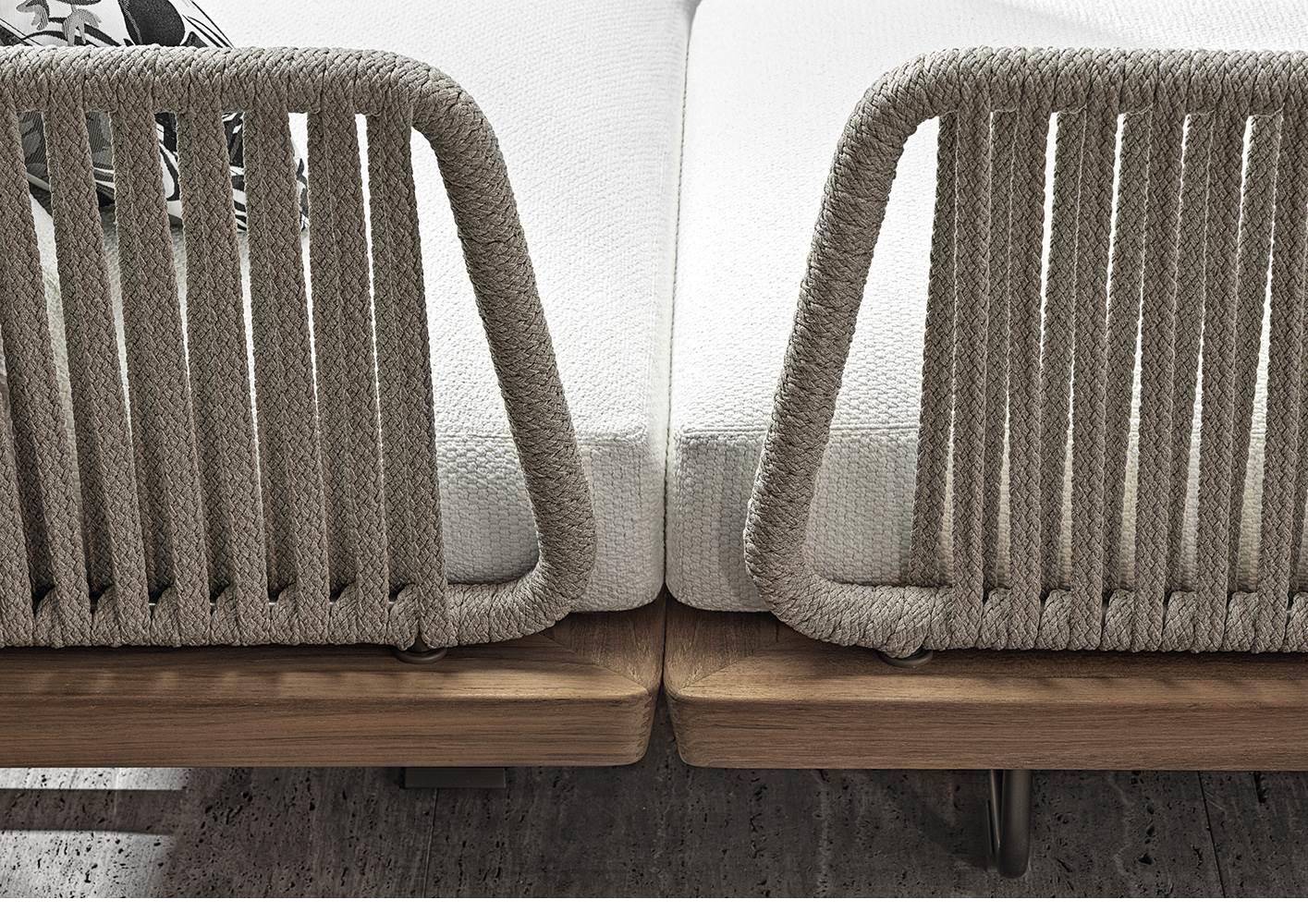 It juxtaposes different shapes and materials: its airy surface in natural teak wood defines its horizontal line, while the curved backrest with interwoven cords gives it a dynamic allure.