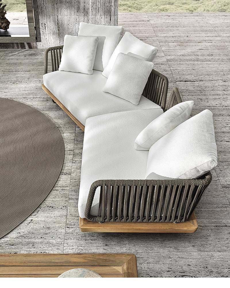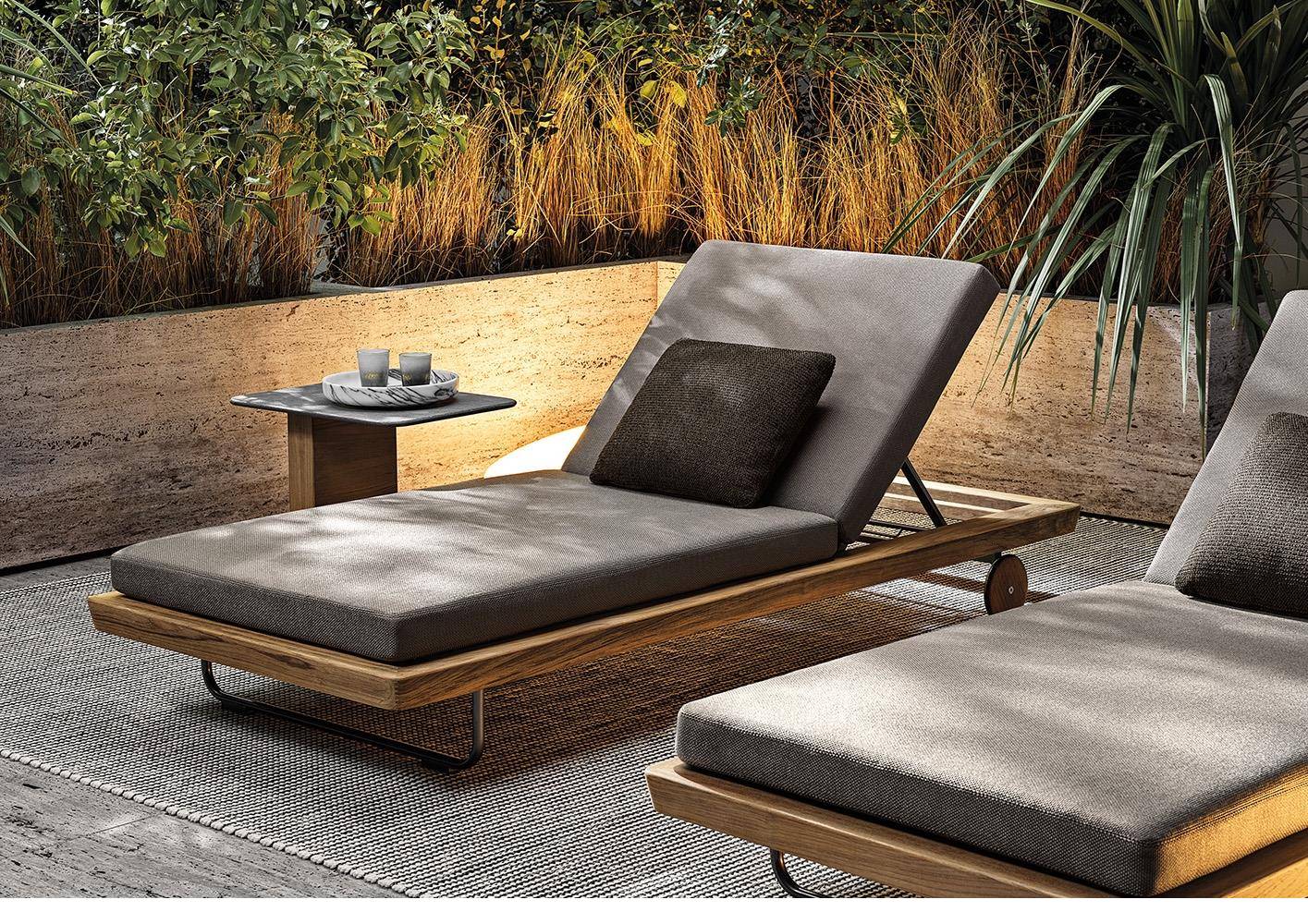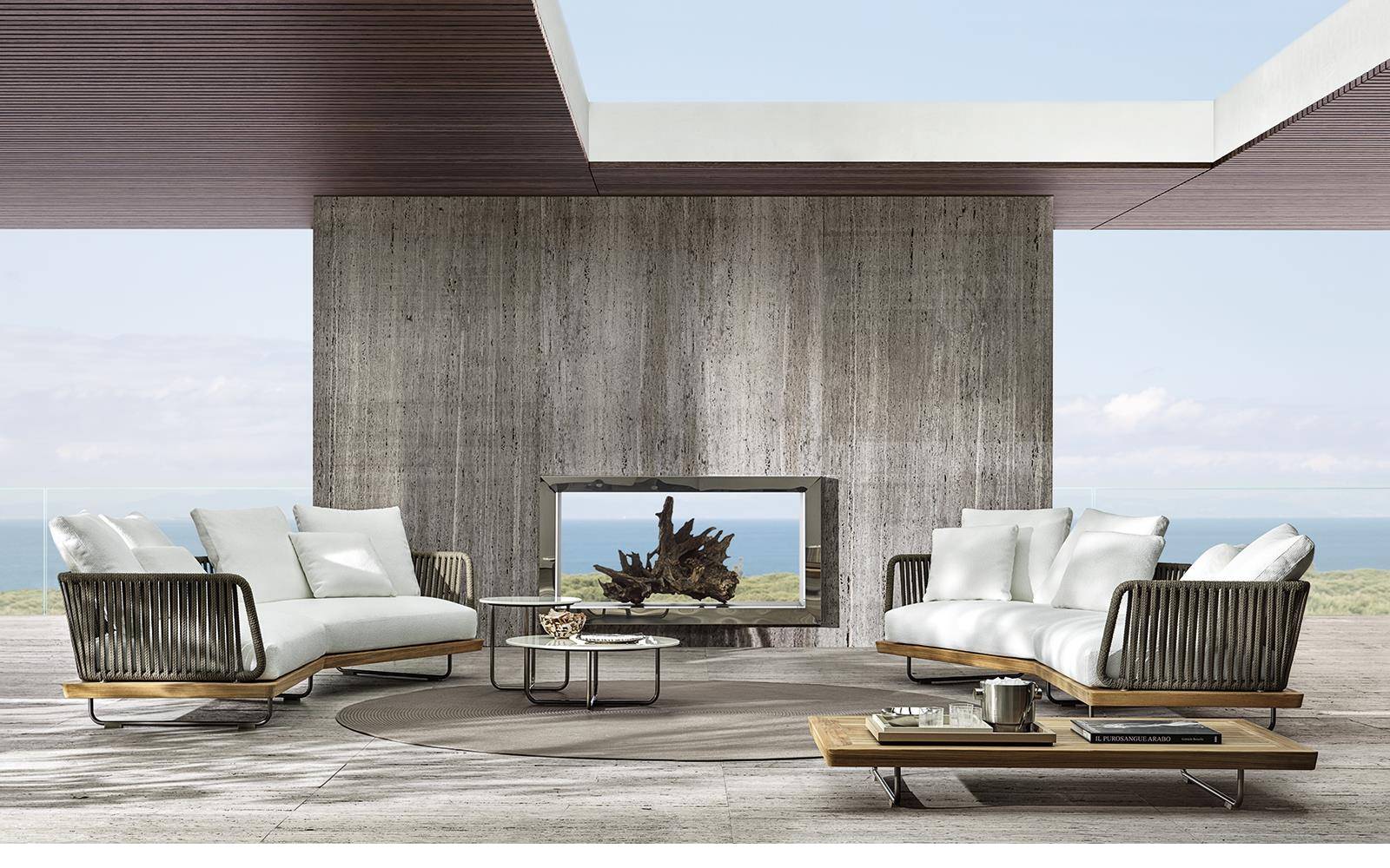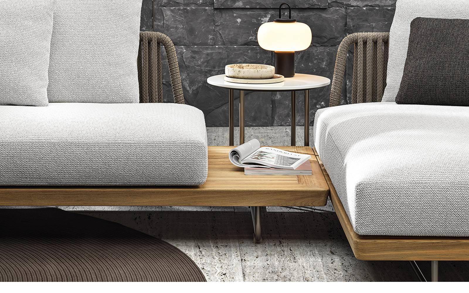 The system, composed of pieces that can be used alone or combined together, offers a variety of compositional solutions thanks to the high versatility of its elements. The family is composed of armchair, sofa, end element with or without extending top, chaise-longue, loveseat, daybed with reclining backrest, and square and rectangular coffee tables.