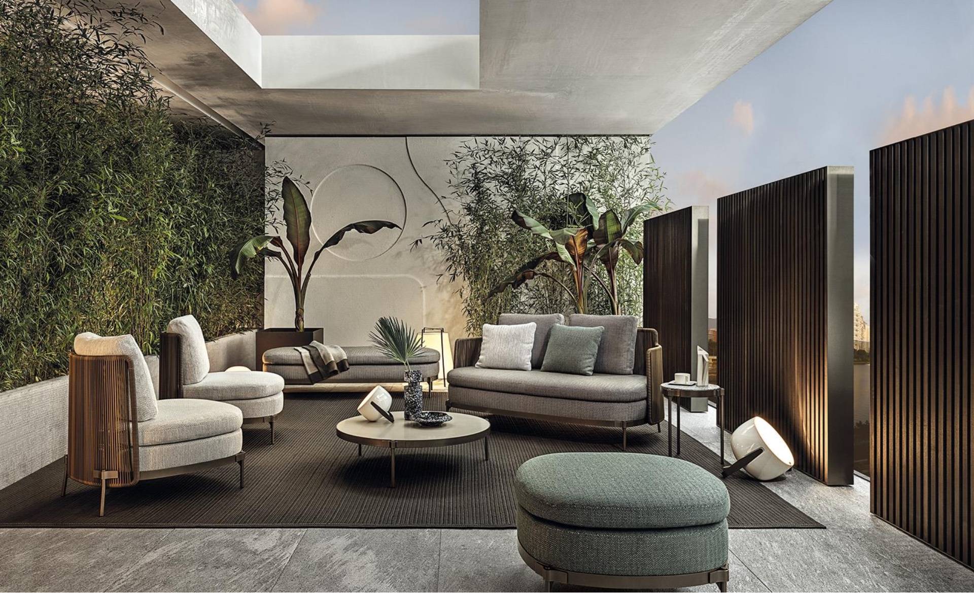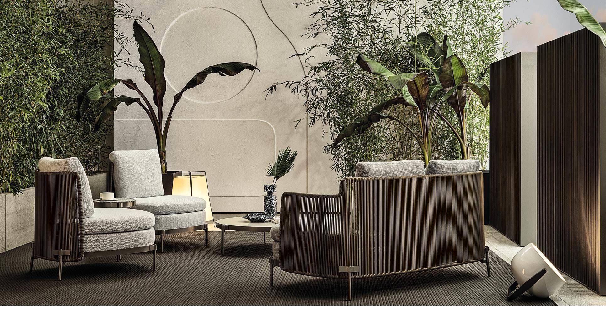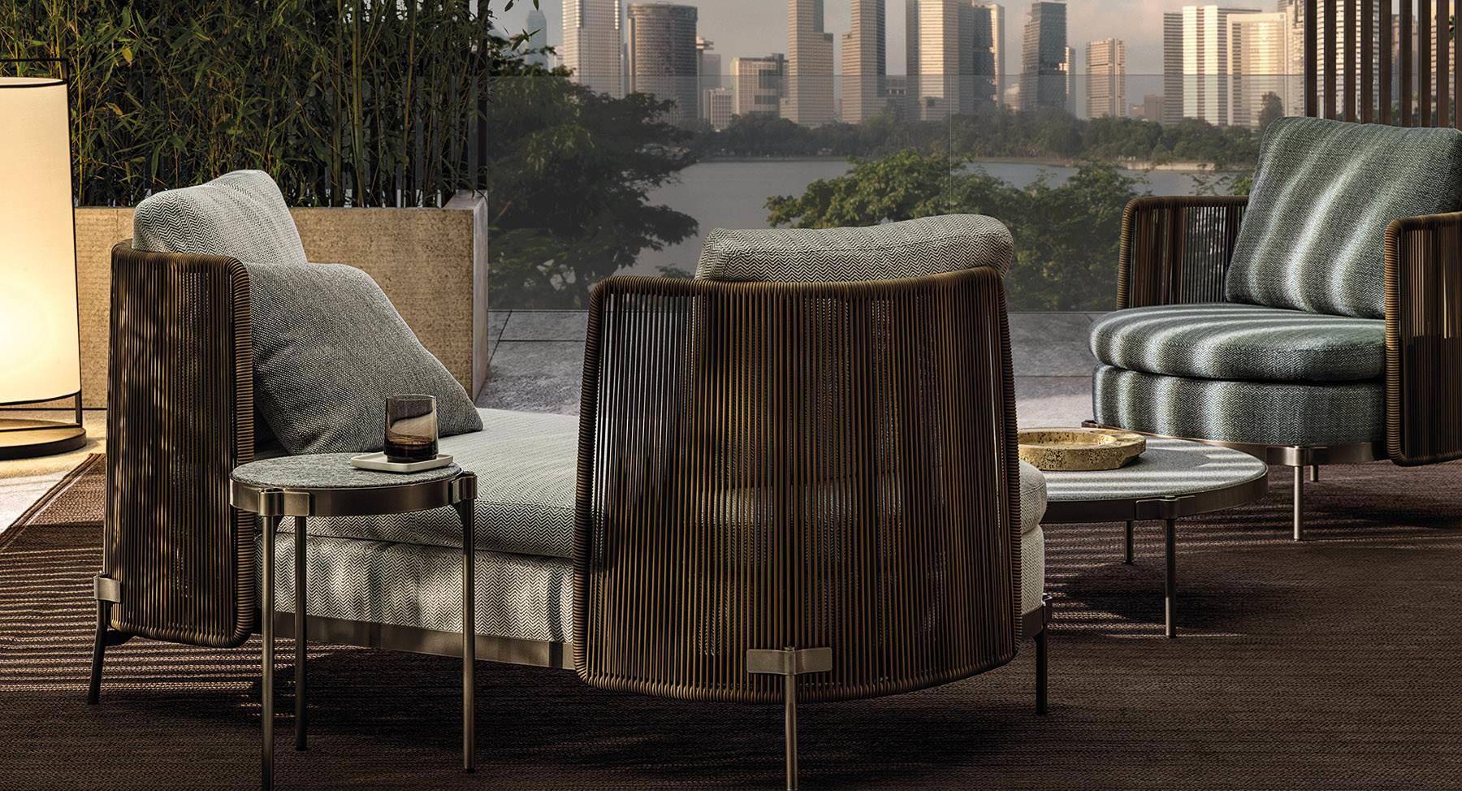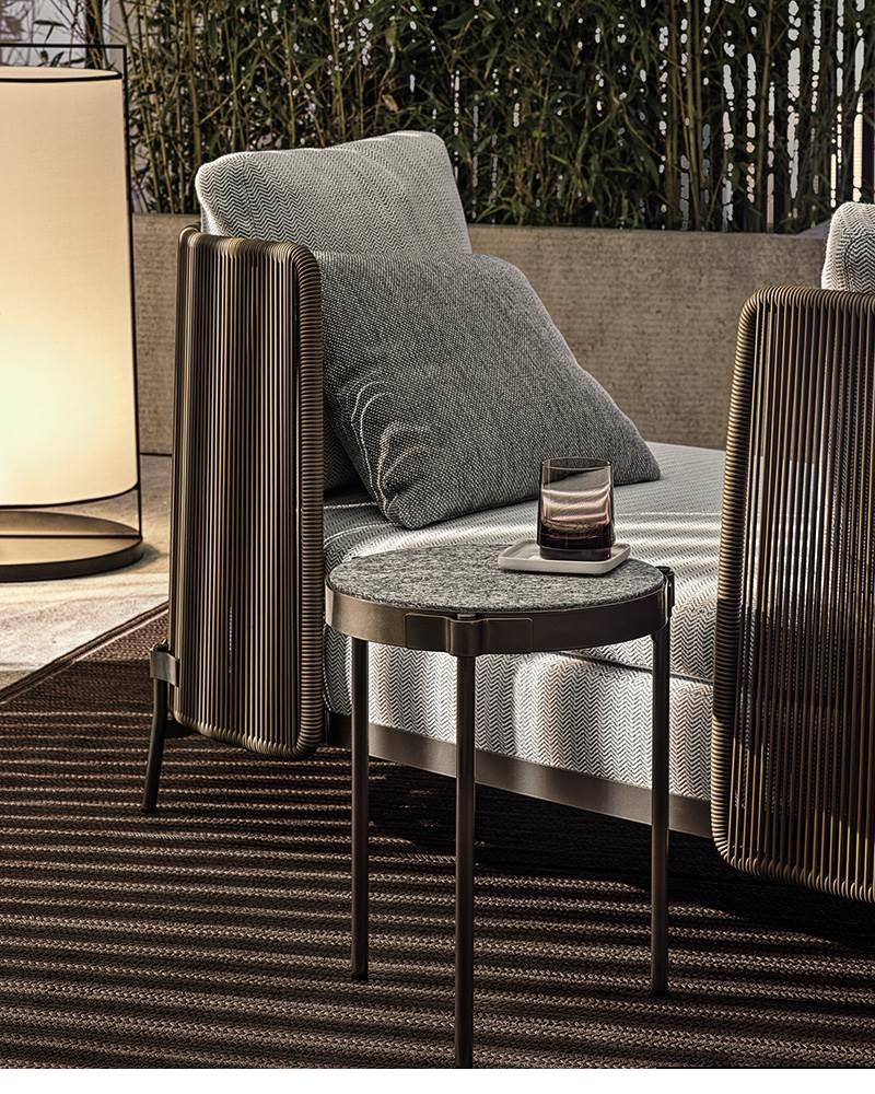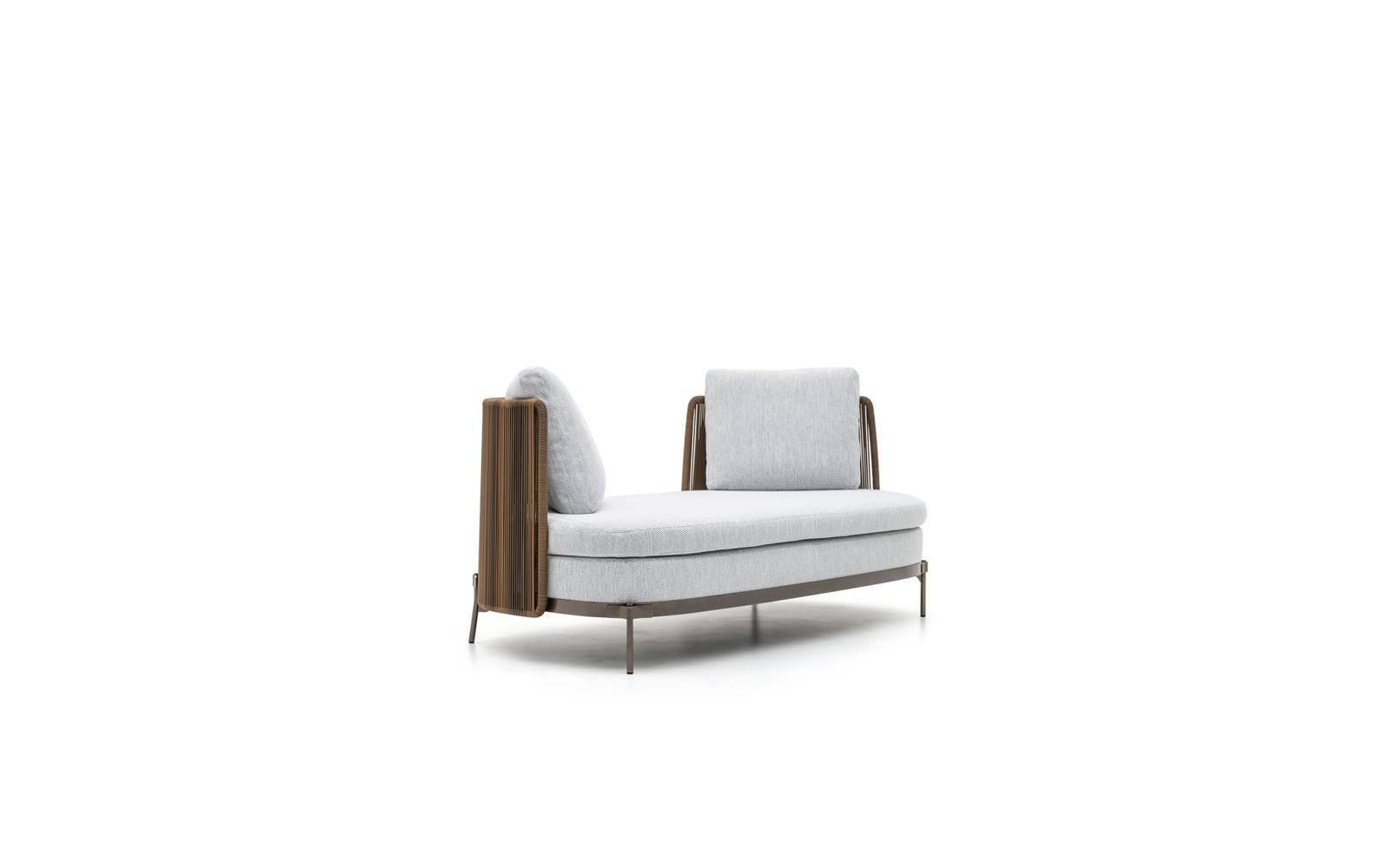 The system offers many elements, ideal for creating relaxation areas also in small outdoor spaces or on urban rooftop terraces: from the armchair to the sofa, from the Paolina chaise longue to the original couch open at the back, from the chair to the coffee tables, up until the stool in two heights of 102 and 115 cm, in the collection from January 2020.