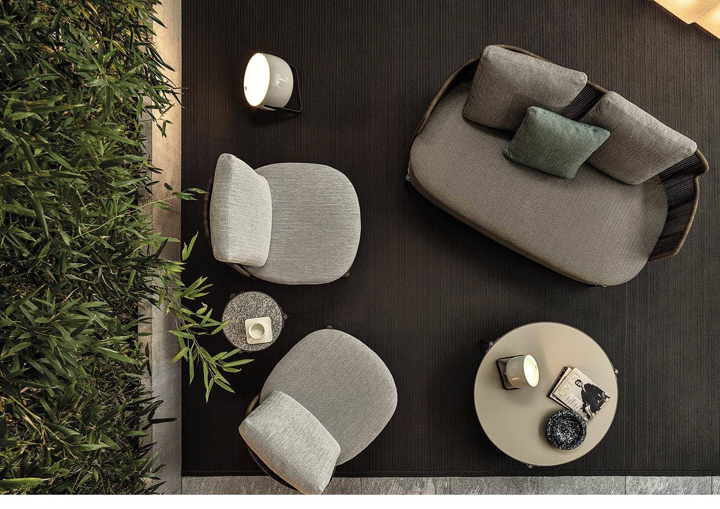 The seats become deeper, larger and more relaxing, while the metal frame, in a new outdoor finish, is covered with the wicker-effect cords available in two colours: Mud and Liquorice.