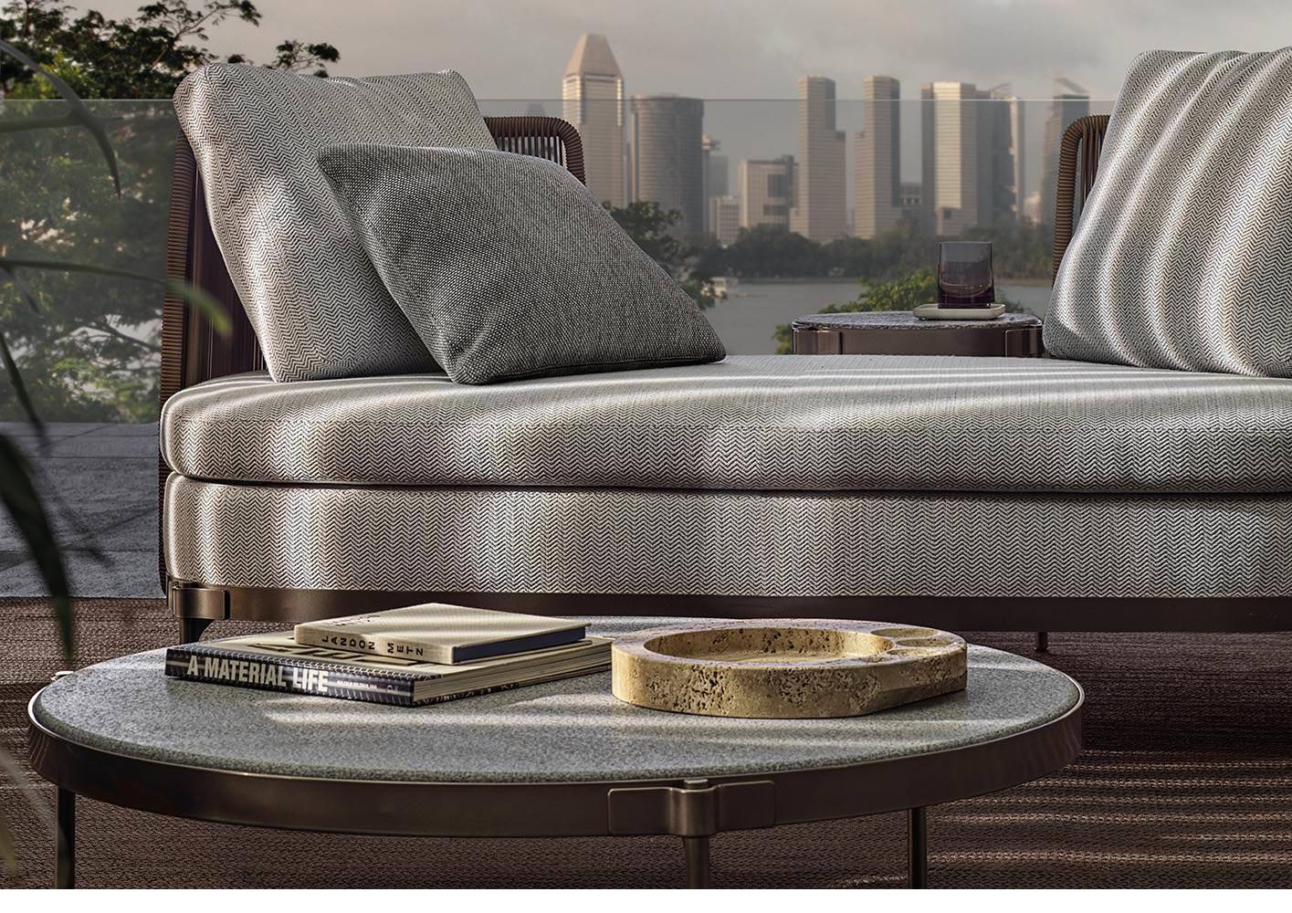 The creative synergy between Minotti and Oki Sato was expressed in 2018 with the launch of the Tape collection - a family of seats and tables characterized by a light silhouette and a strong identity - and the Ring and Waves coffee tables.
