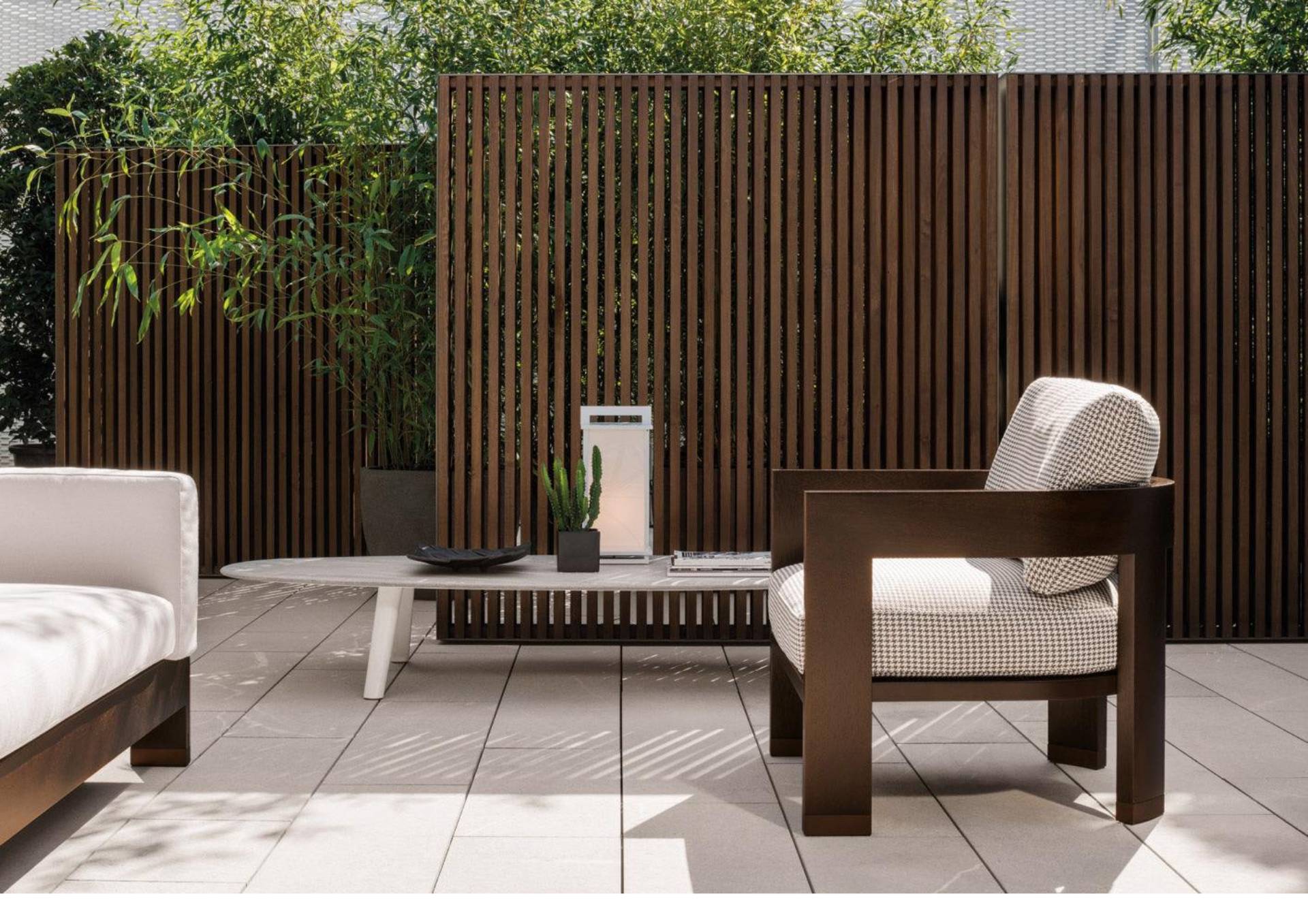 The new dark brown iroko finish and covering in Mali pied-de-poule textile emphasize the elegance of the Warhol “Dark Brown” Outdoor armchair, distinguished by its compact footprint and sleek design.