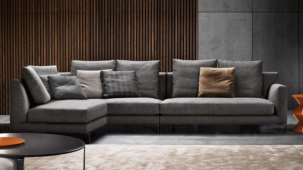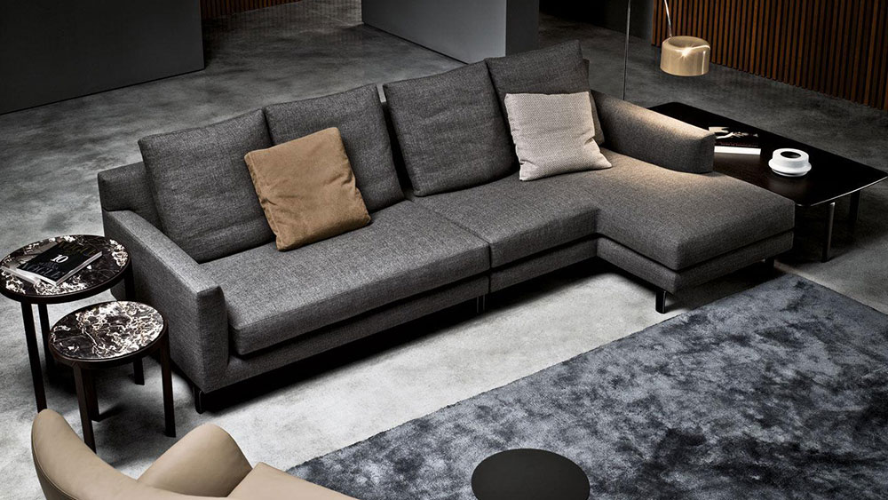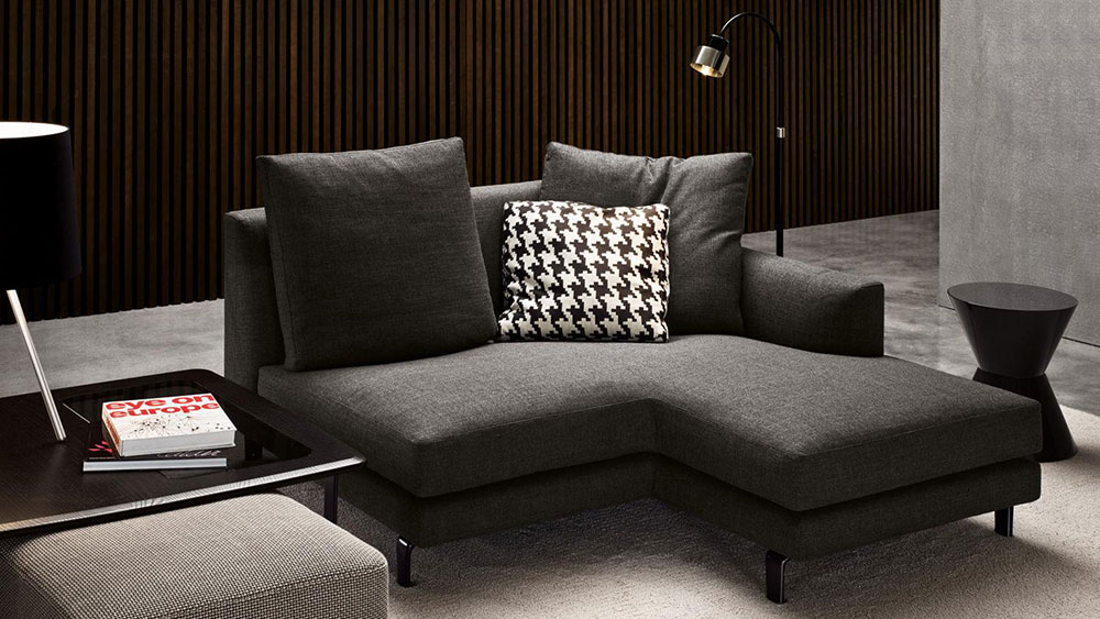 Spotlight on feet: made of die cast aluminium, in Pewter colour (a shade created by Minotti Studio) they have sinuous lines and classic structure, in both proportions and materials. Molded, they are the result of technological research and reinforce the association between Minotti and uniqueness. In terms of foot placement, they’re seen in profile when the sofa is viewed from the front, while the flat surface is visible when the sofa is viewed from the back or side. A totally new design concept: unlike traditional chaise longues that form the end unit of a seating composition, this element already possesses a “hint” of the sofa in its shape. Thanks to its “L-shaped” design, it foreshadows the sofa and carries it forward. Minotti also solves the problem of overlapping feet in the corner, and preserves the purity of design. A sense of clarity enhances the value of this piece in a key area of home living - the place for socializing with friends and enjoying family companionship.