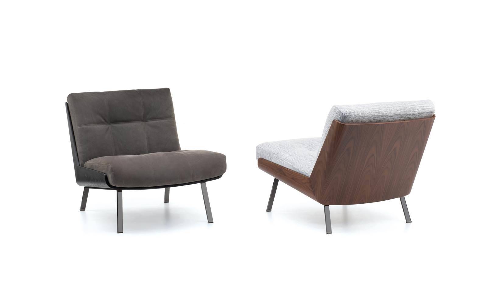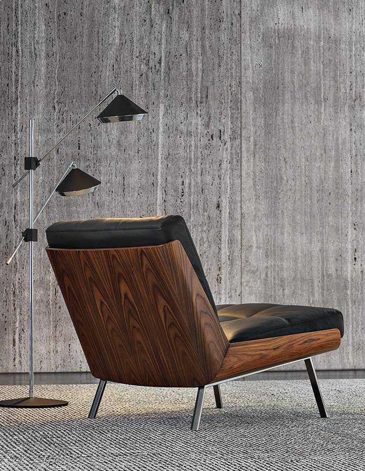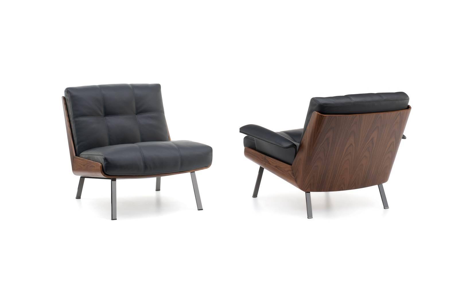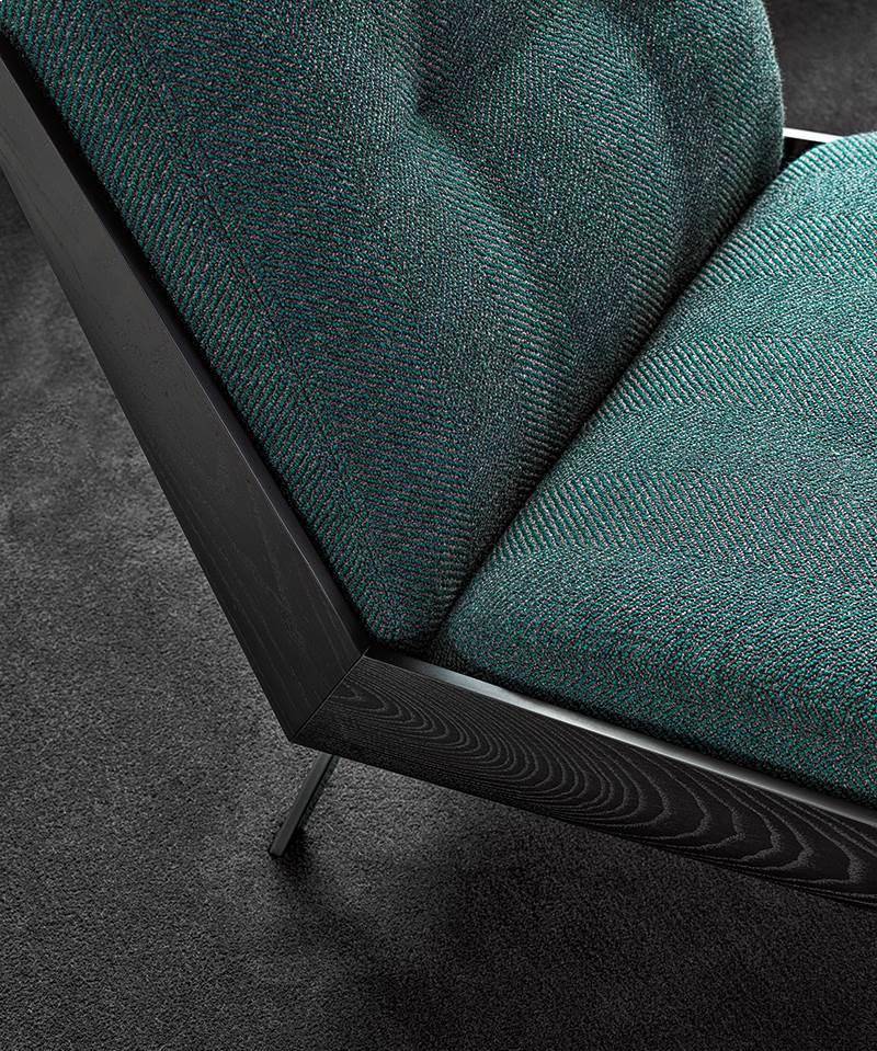Created using sophisticated wood crafting techniques, the curved shell comprises two elements joined at a 45° angle, with a sloping backrest that guarantees maximum comfort. In palisander Santos or flamed ash veneer with Liquorice colour lacquer, the shell offers a snug fit for the cushions, and sits on a metal frame with legs in a Black-Nickel finish.