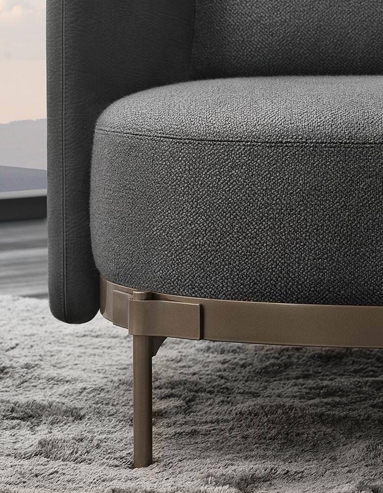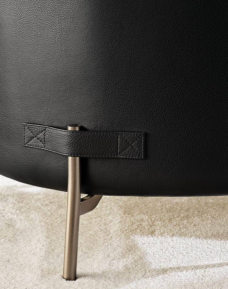 Customizable in a wide range of leather and fabric coverings, it presents two possible sets of pairings. In one version, the fabric covers the back and the seat cushion, while the shell and the tape detail are in leather of the same colour; in the other, the textile envelops the back, the seat cushion and the entire shell, while the tape detail is in Bronze-coloured saddle-hide.