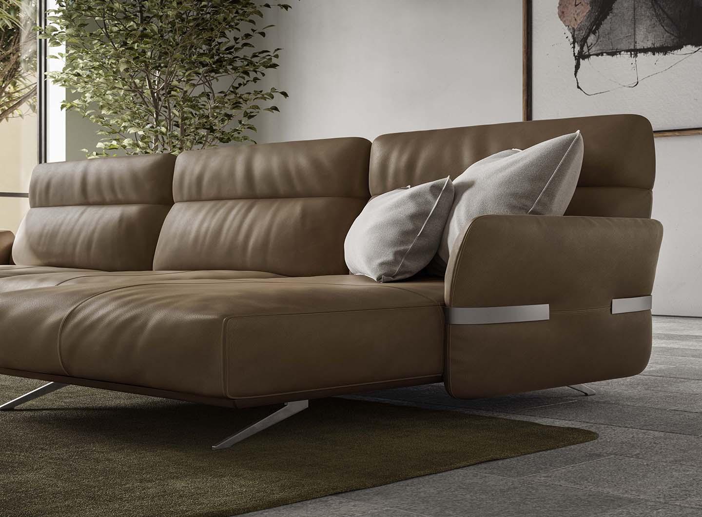 The joyfulness and generosity of Mediterranean culture translates into a versatile seating system with a welcoming familiar design. Playing with heights and geometrical shapes, the armrests have been elevated with satin-finish metal rings on both ends, matching the feet in the same finish.