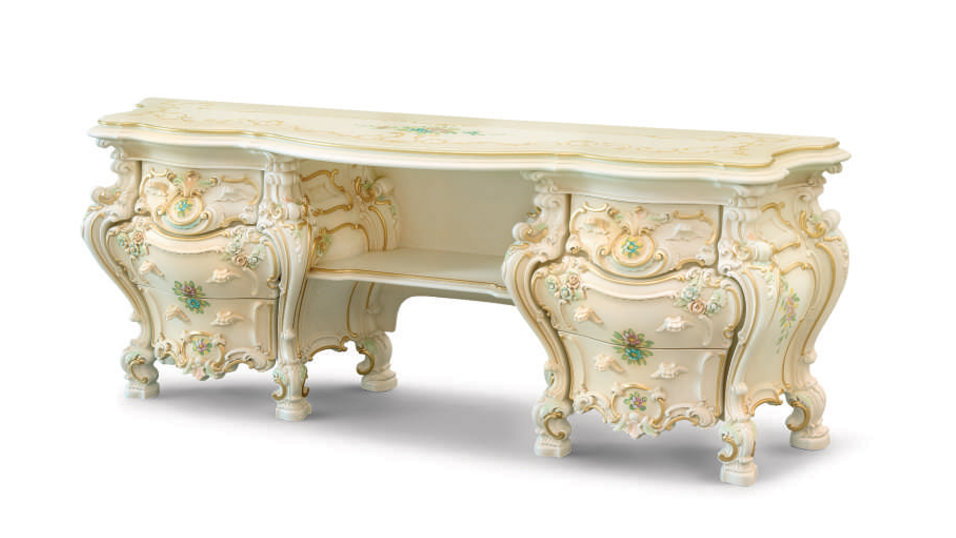 Dressing table with 6 drawers and shelf. Wooden tabletop with glass top. Decor - polyurethane foam. A wide choice of finishes. The mirror is ordered separately.