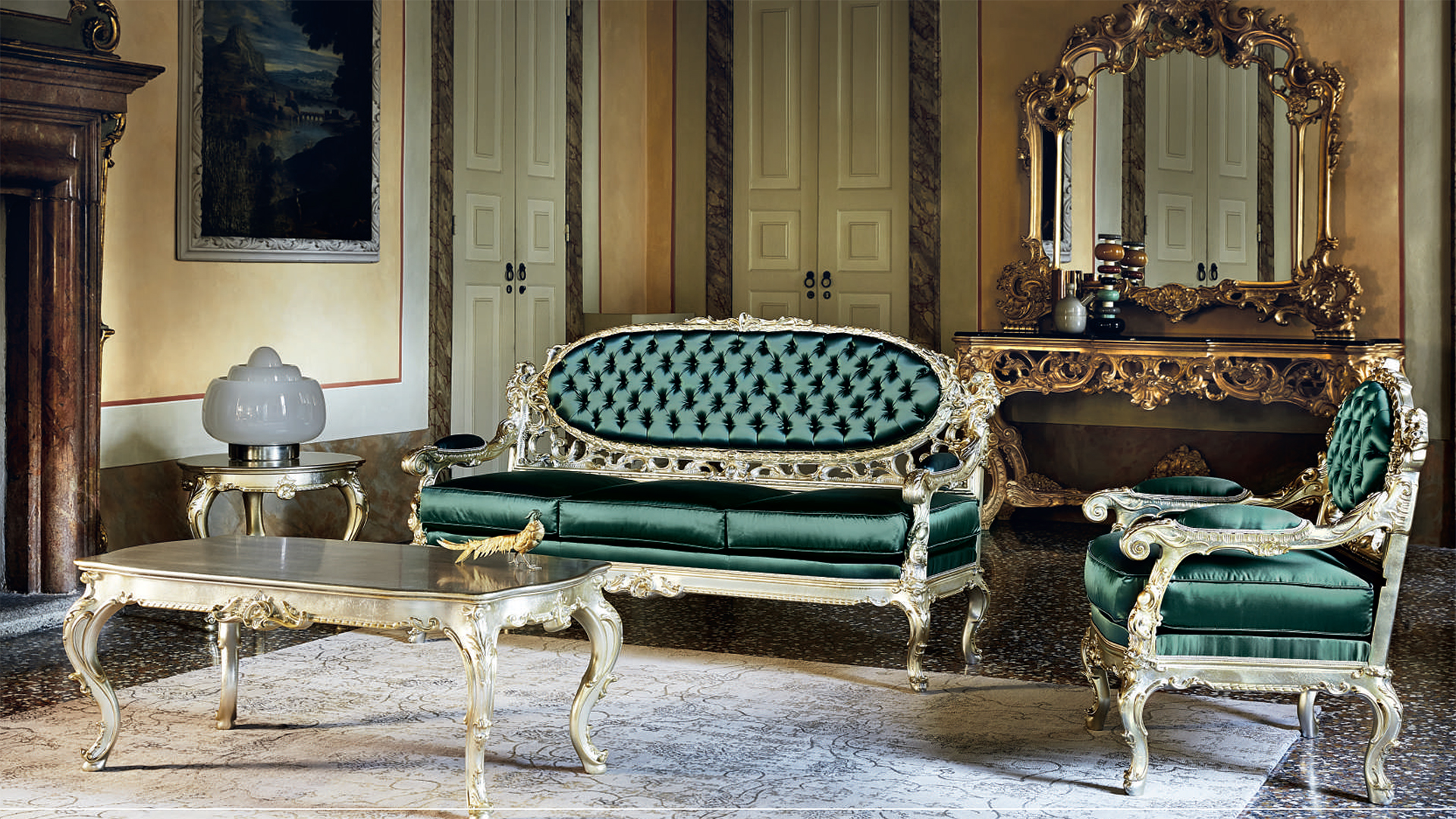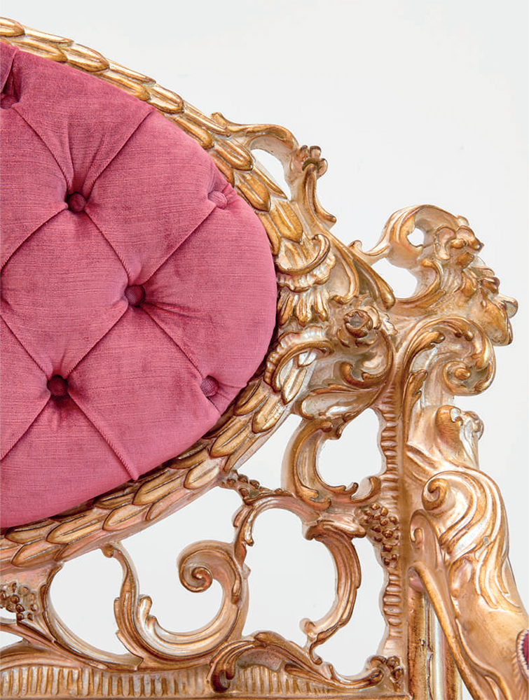 Double Dedalo sofa from Italian manufacturer Silik. Model on a frame of solid wood, painted in Golden color. The back is decorated with ornamental stitch-Capito. The model is decorated with carvings. In addition offers decorative pillows. The model is made in classic style.