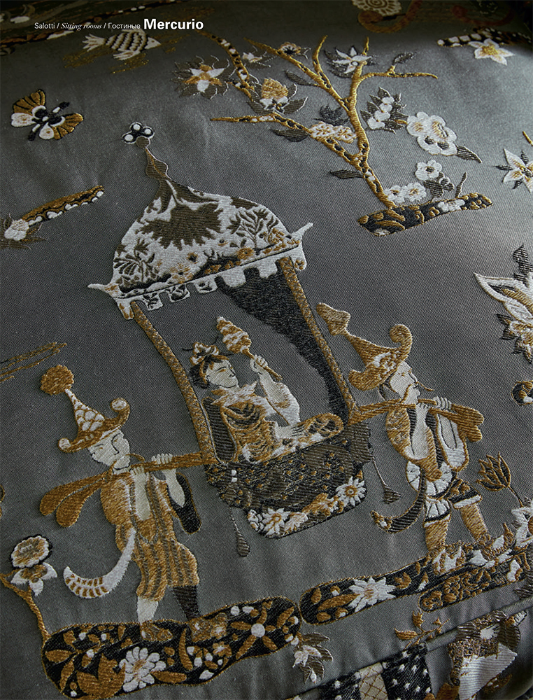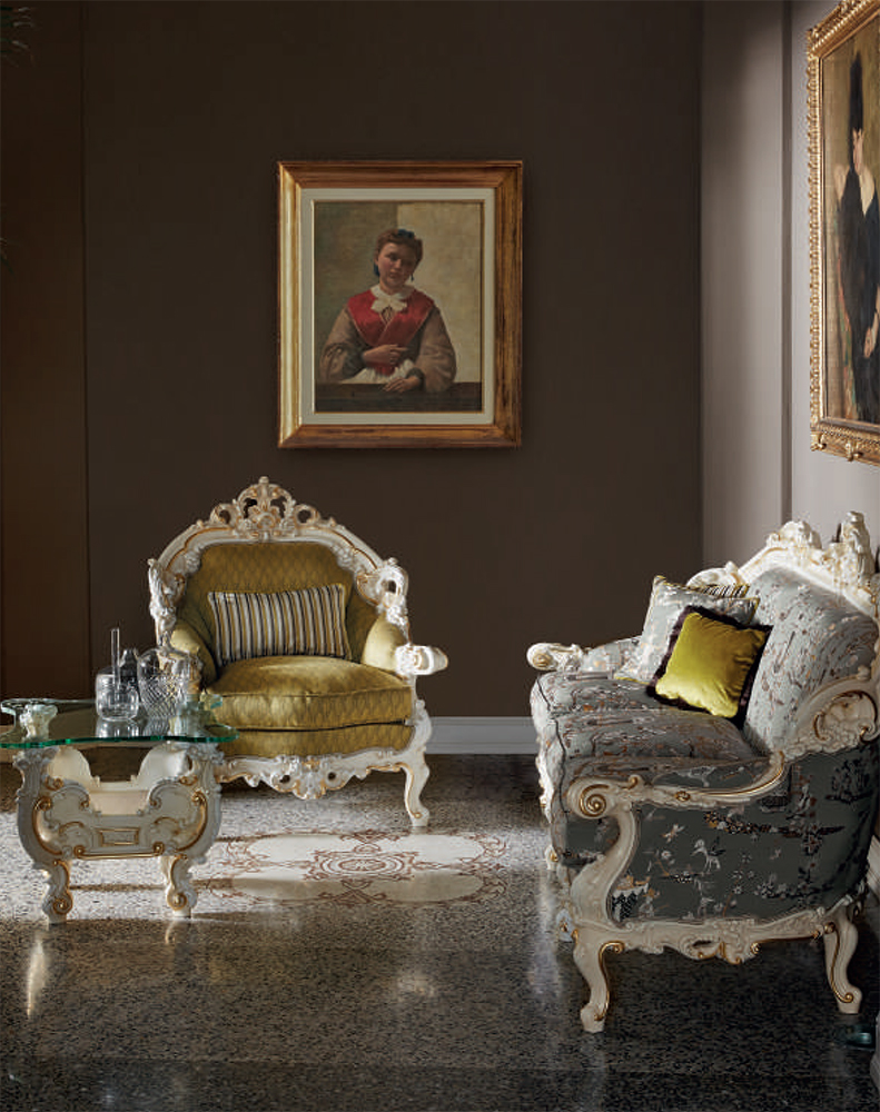 Three seater sofa Mercurio, from the Italian manufacturer Silik. The neutral model is made in Baroque style. The frame is made from solid wood. Colors to choose from a range of companies. Back and legs are decorated with carvings. The upholstery is made of dark-colored textiles. Also available twin model in the same design.