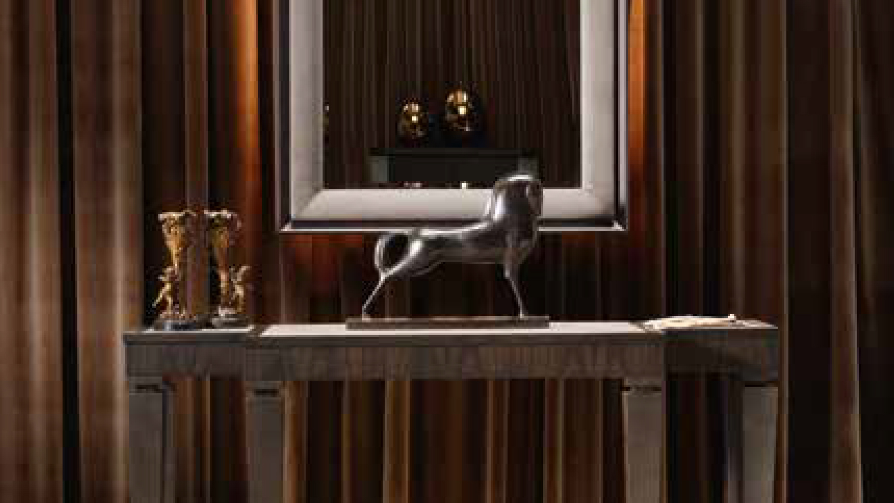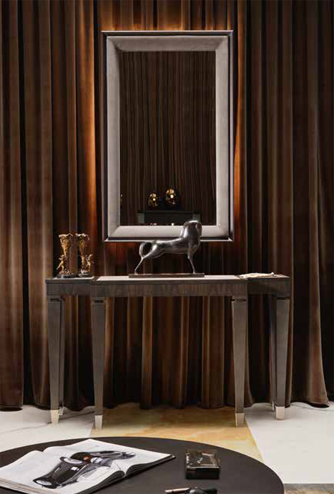 Wooden console table, tinted wooden beech structure, polished stainless steel details.