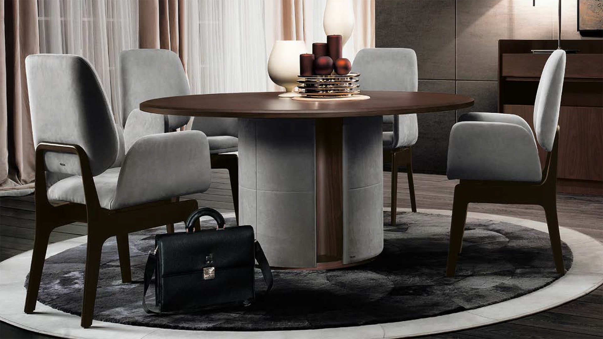 Byron Round is the refined dualism of wood and leather that perfectly integrates with the furniture for modern halls that also expresses classic style. This table is the protagonist of the environment it is placed in: its rounded and refined aesthetics stands out enhancing the rest of the space.