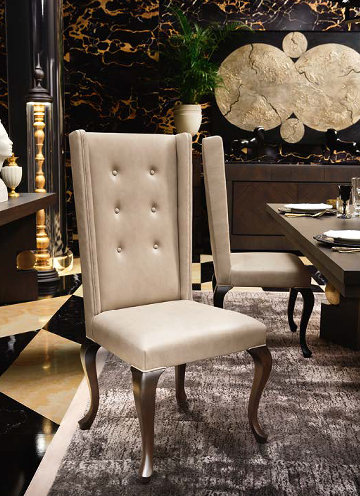 Chair with leather upholstery on beech legs Clelia from the Italian manufacturer Smania. The model is made in art Deco style. The frame is made of wood, upholstery - textiles or leather of your choice. Curly legs made from beech. Colours in stock. Clelia chair is incredibly comfortable with its soft seat and backrest. This chair is suitable for living room and dining room.