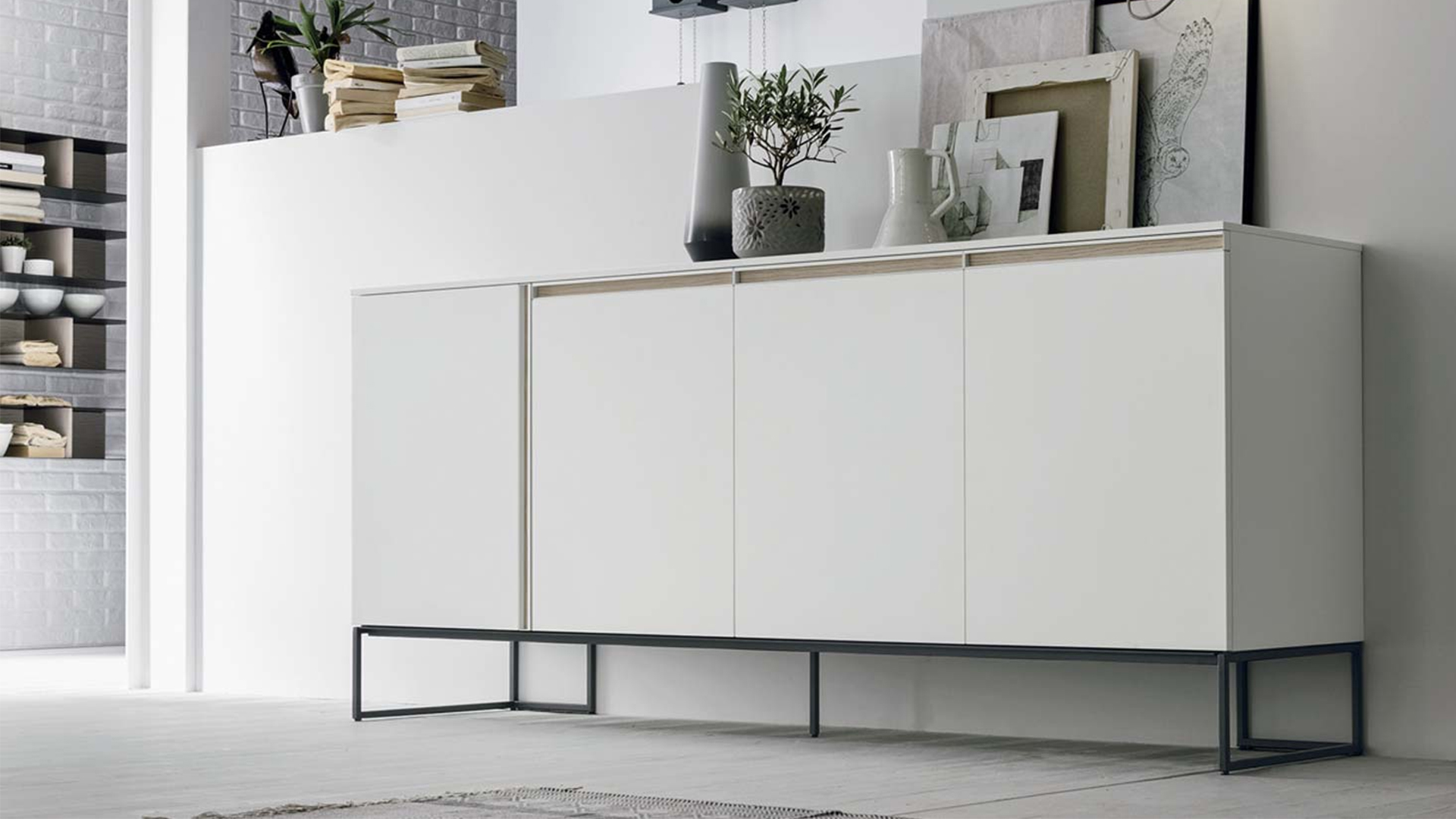 Regolo sideboard with a textured matt chalk white carcass, a textured eastern ash insert and anthracite 160 metal base.