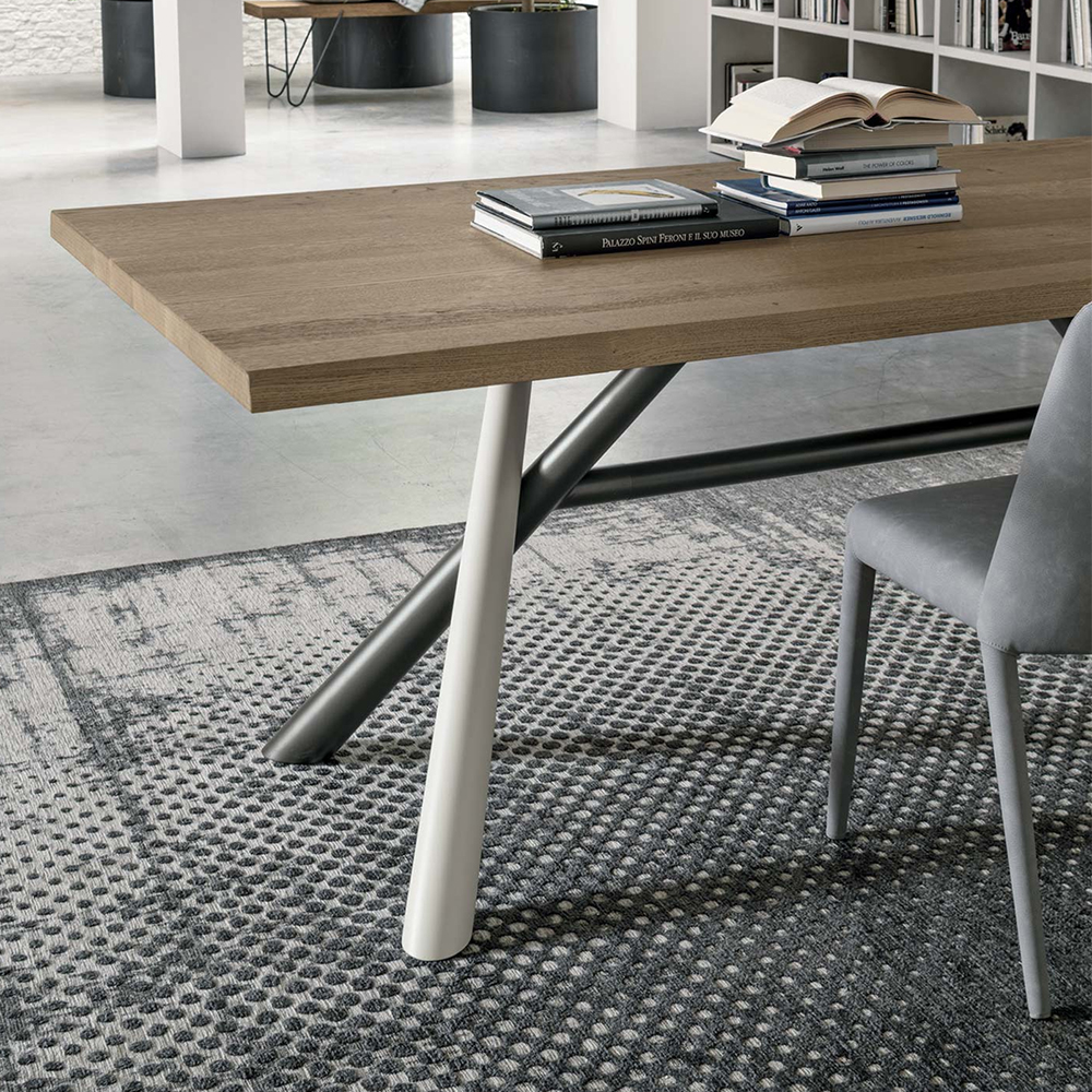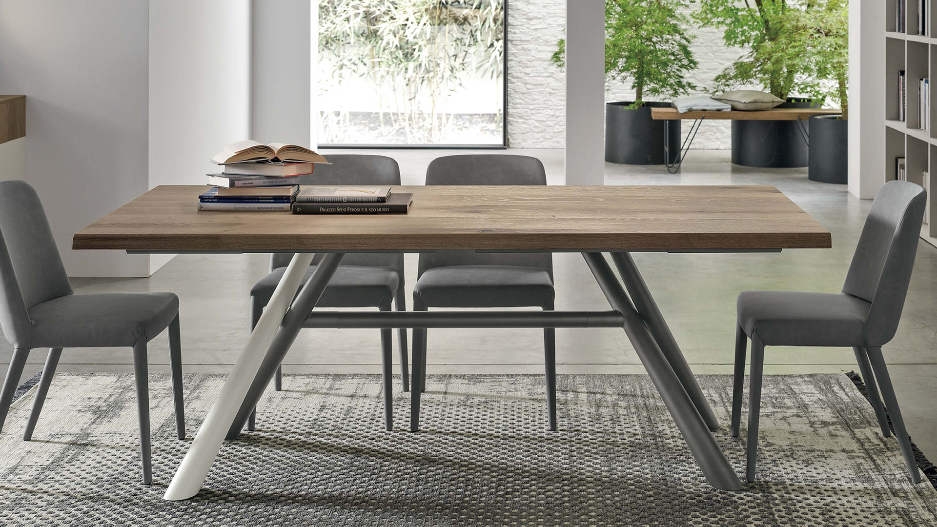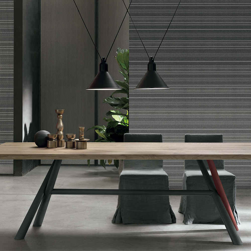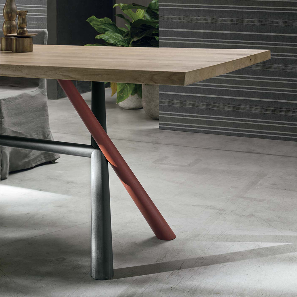 The extra-thick wooden top and the pattern created by crossed legs with coloured detailing result in an eye-catching table whichever way you look at it. The glass legs change shape but retain the same style.