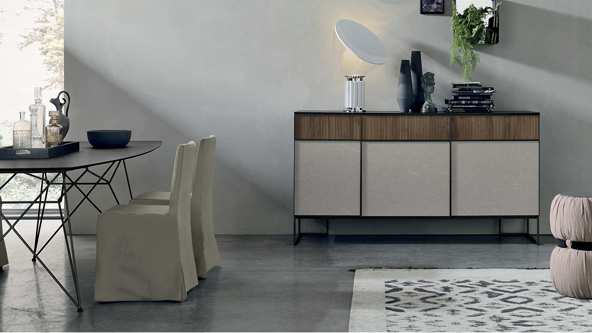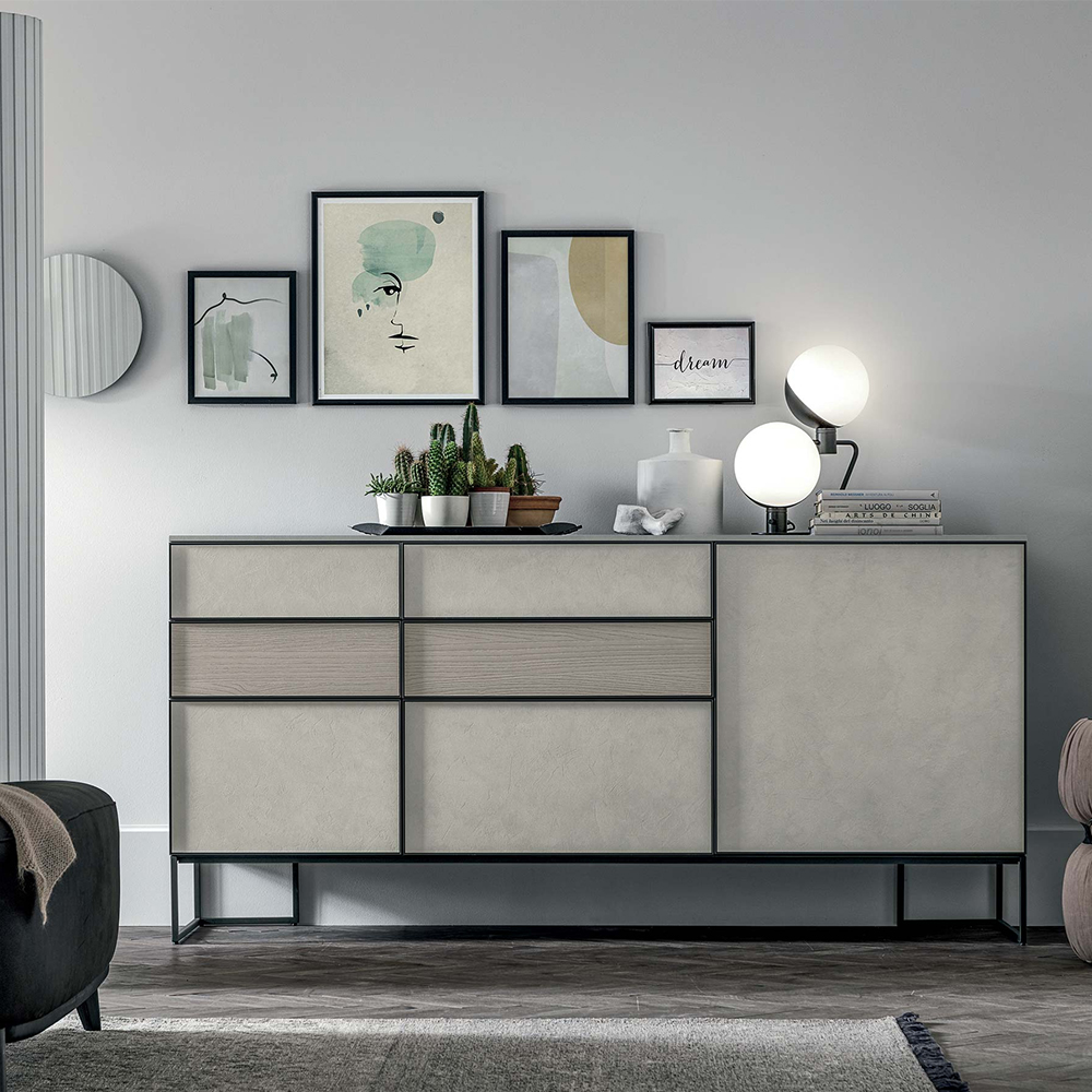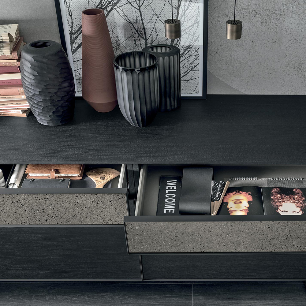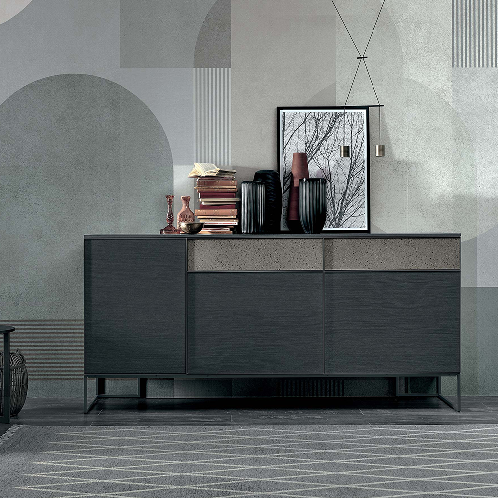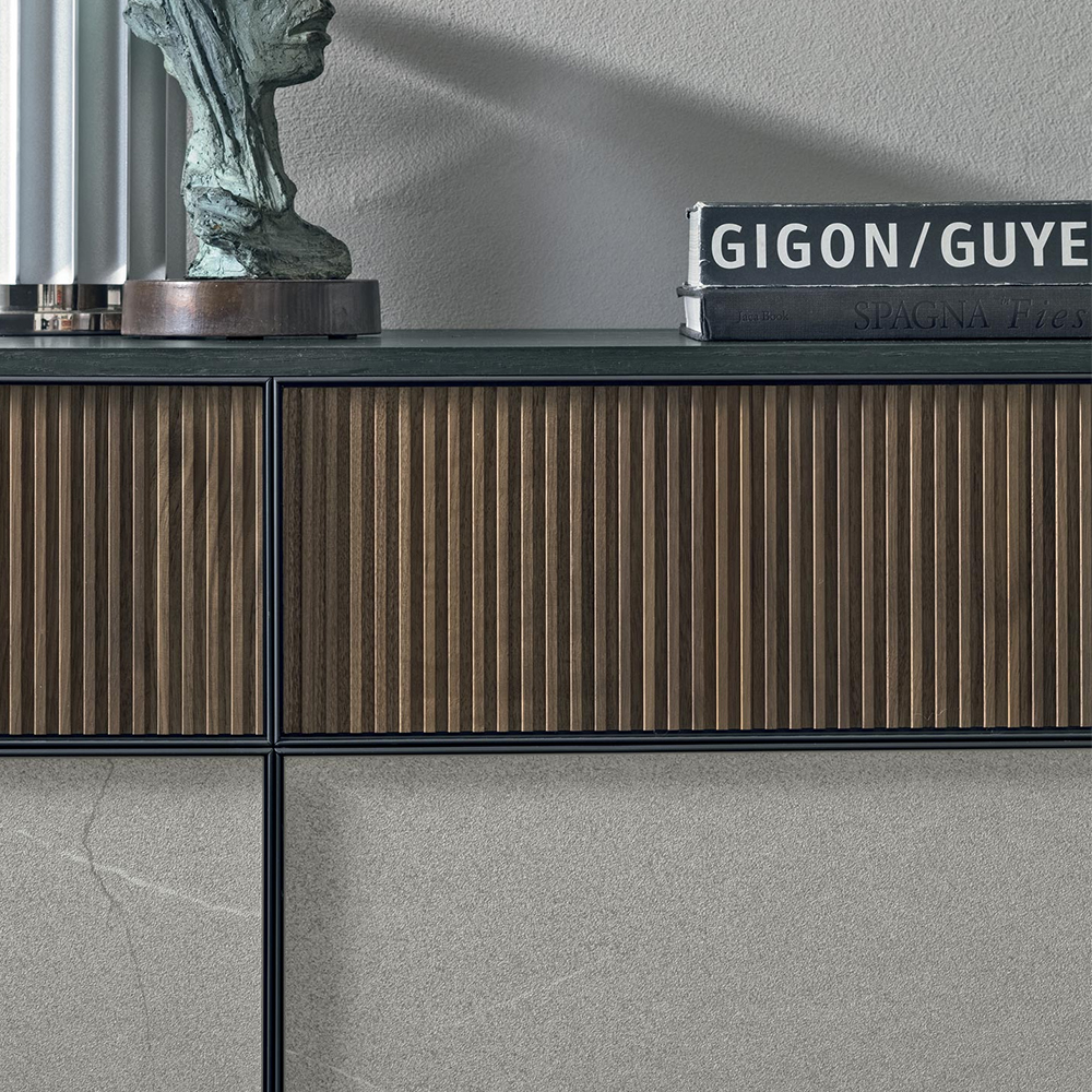 The metal edging frames the reeded walnut and stone effect fronts: this combination of finishes gives the furniture a strong graphical and textured appeal. The sideboard is available in various configurations to adapt to all modern styles.