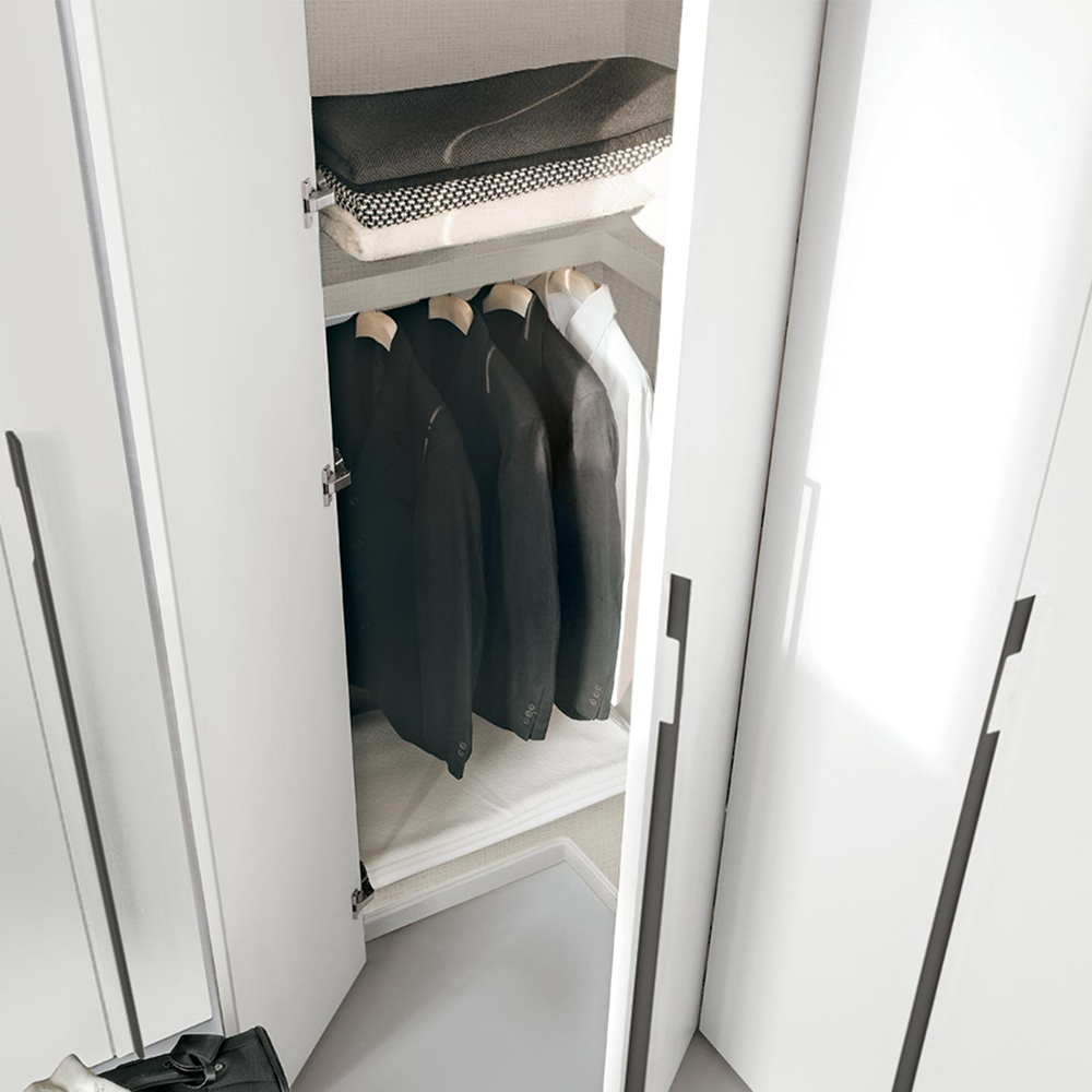 A corner wardrobe that uses all its space. The opening of the two doors of this leaf door version allows easy access to the corner unit, fitted internally with a practical shelf that follows its shape and with essential hanging rails.
