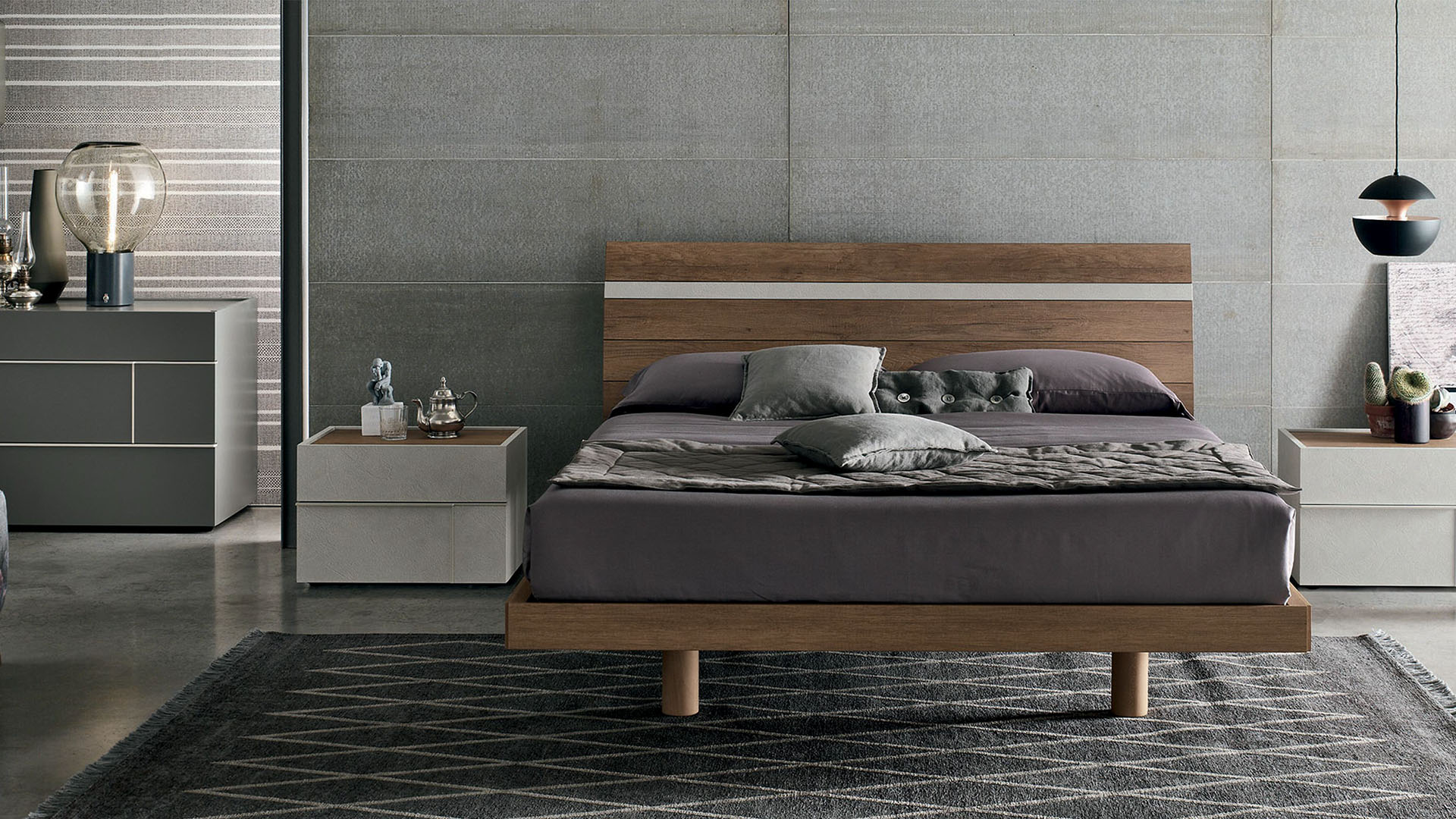 Bed in light knotted textured and textured light cement finishes.