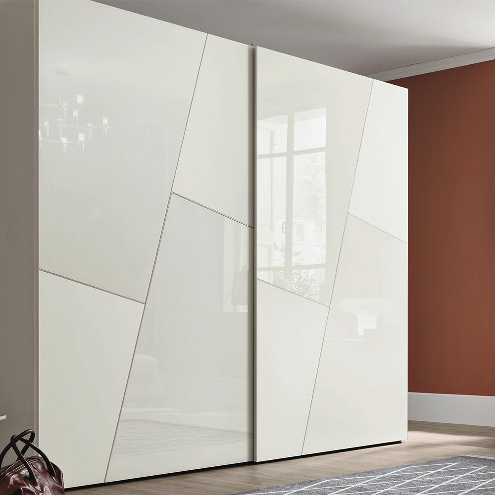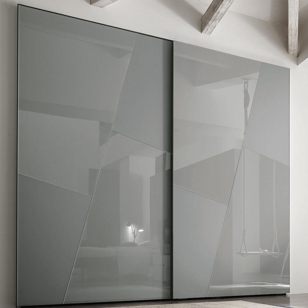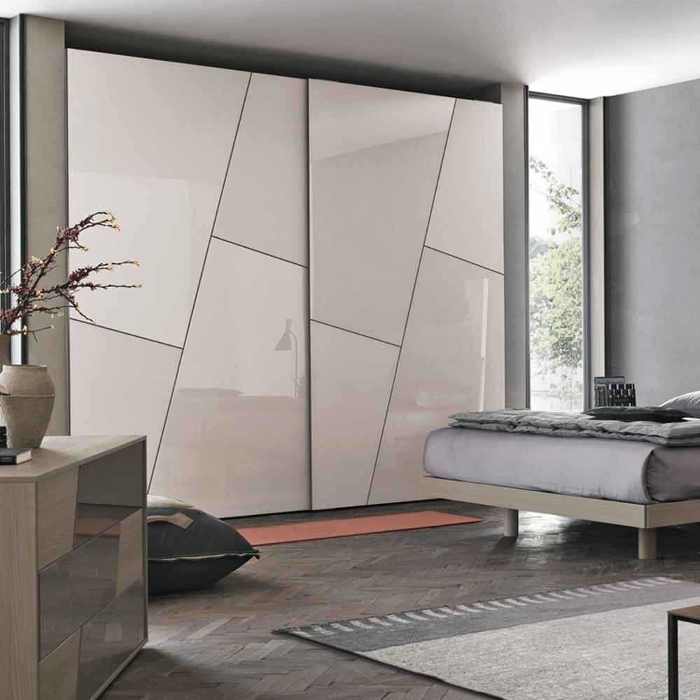 The diagonal shapes on the doors become the decorative motifs that distinguish Kross. Their contours draw oblique lines that combine with the light appearance of the satin or lacquered glass panels. Single-coloured, lively yet subtle effects.