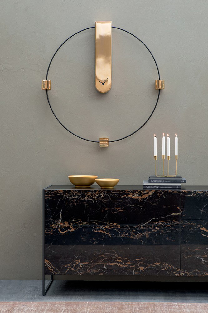 Analog clock in lacquered metal and ceramic inserts. Scan tour time for aesthetic refinement.