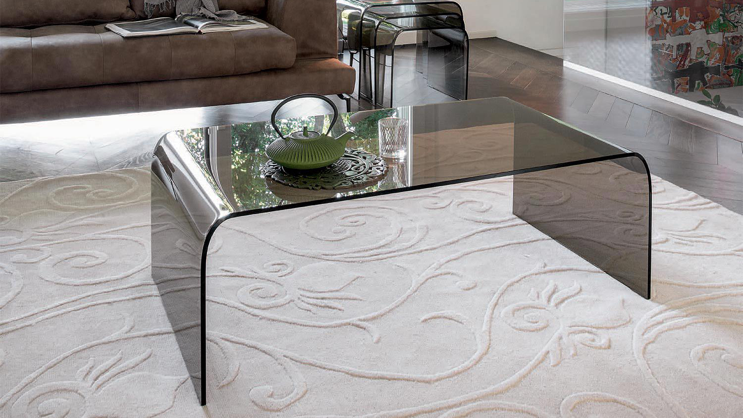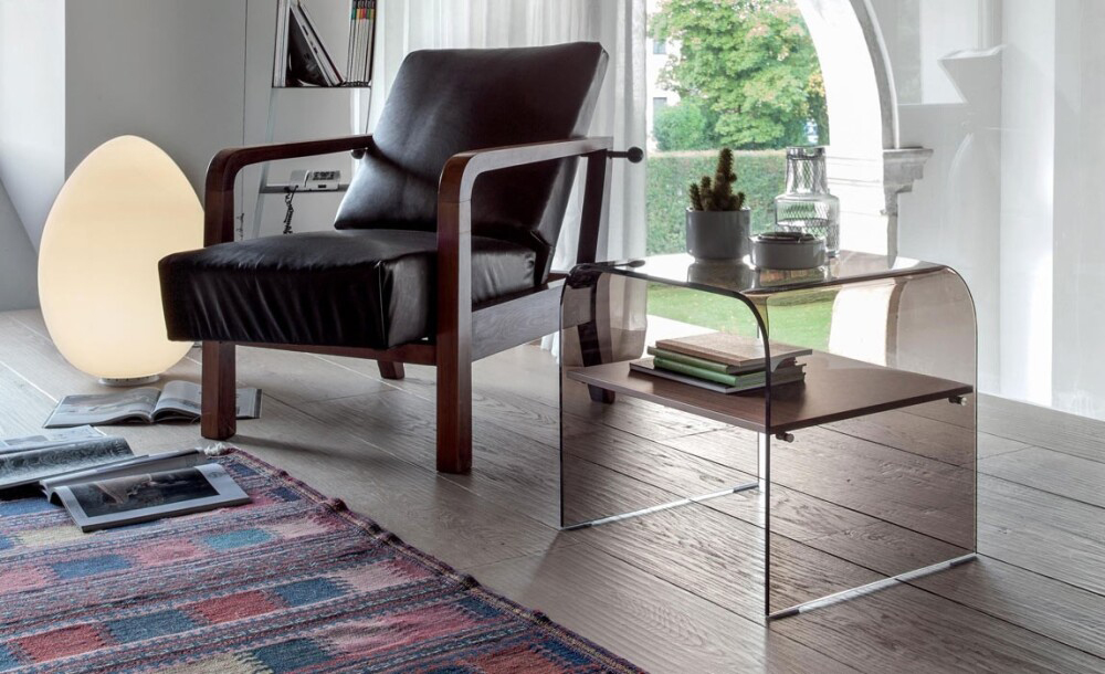 A curved glass structure covers the wooden, or glass shelf, inserting a horizontal line that provides rhythm and complexity.