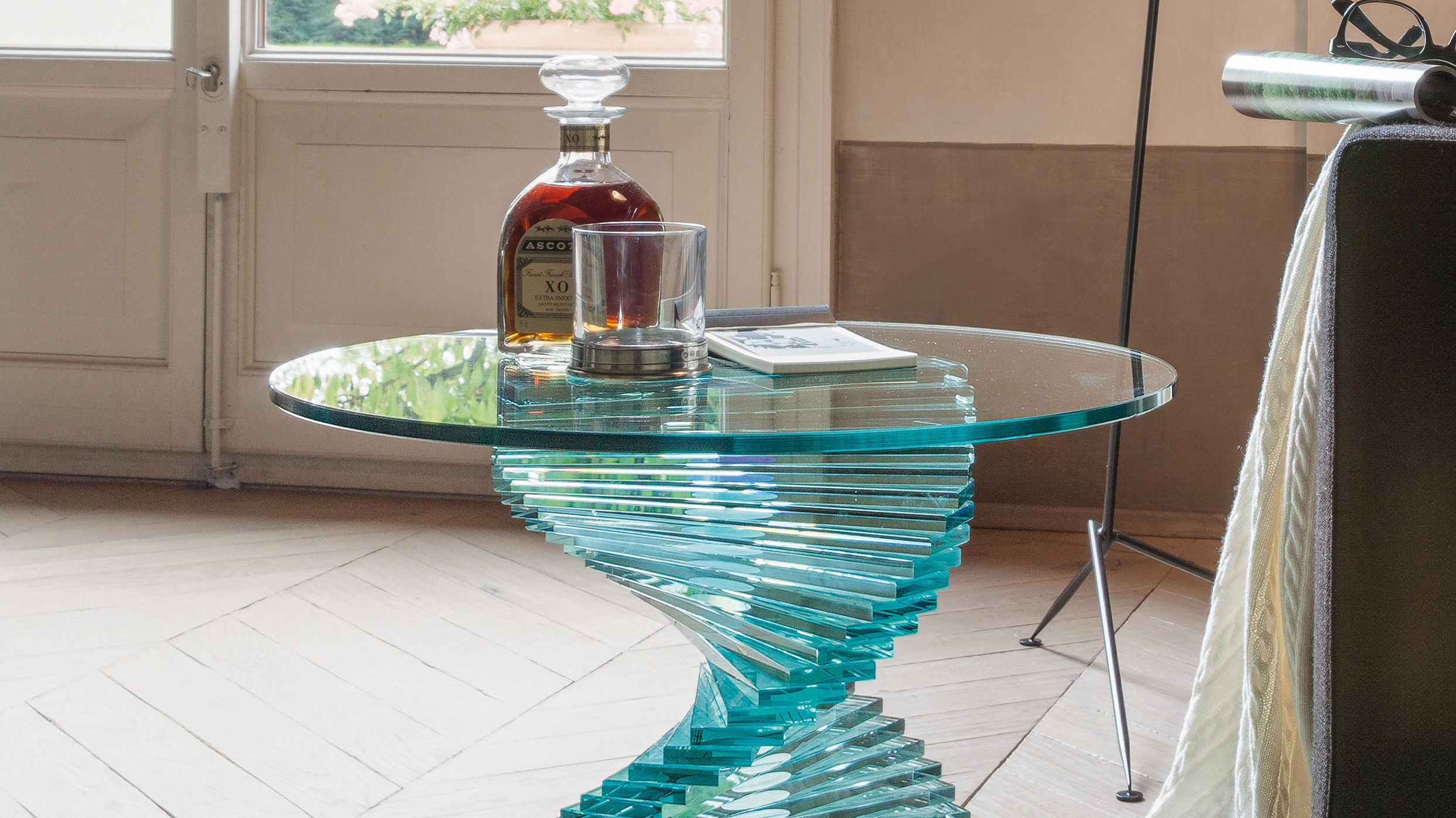 A spiral developing upwards, made of thin glass bricks that provide light refraction, playing with colors and reflections.