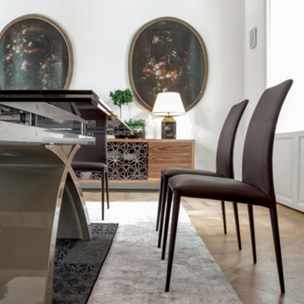 Charm`s smooth and light angles are covered in a high-density foam: this materials is used to create extremely comfortable and lasting chairs.Its covering comprehends every leather available in Tonin Casa`s sampling.